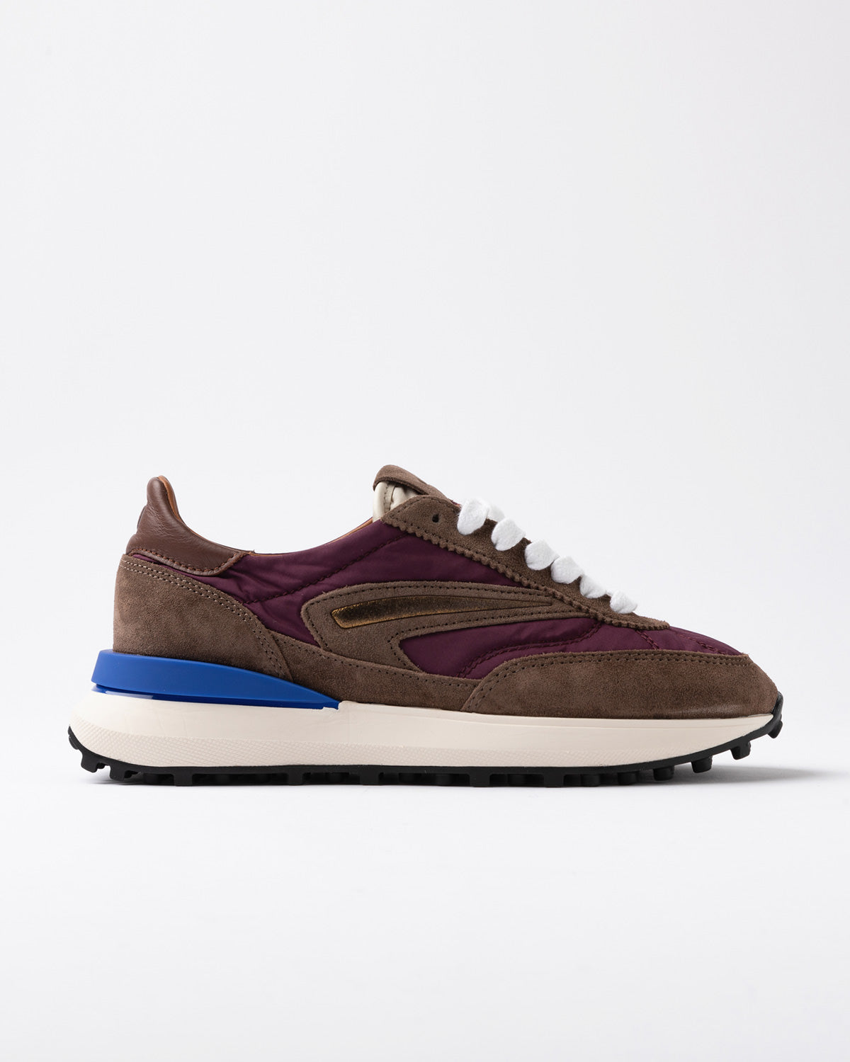 Running trainers in prune coloured nylon and brown suede.