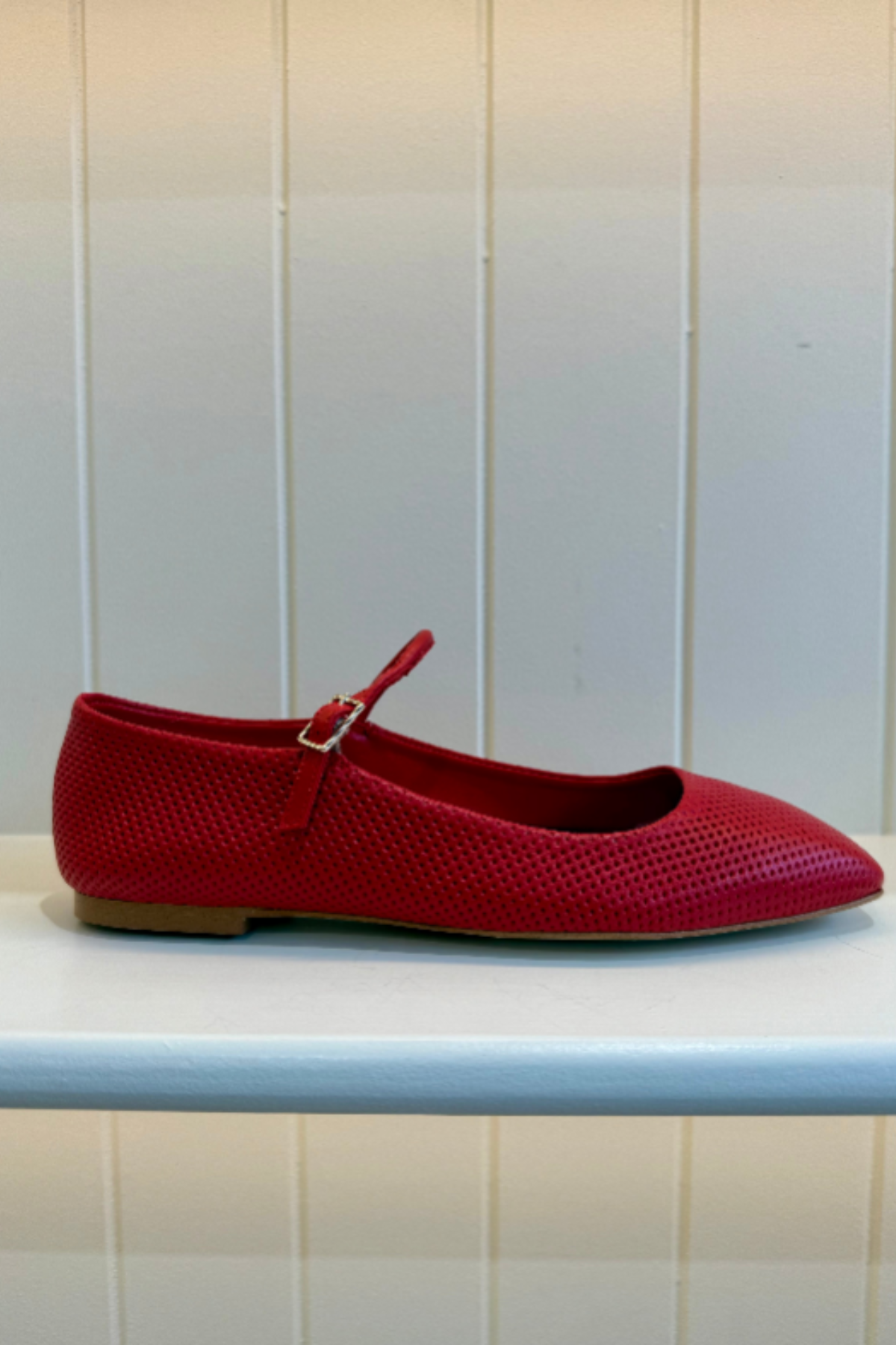 Ballerina styled flats in soft, perforated leather with slim strap with buckle over the foot.