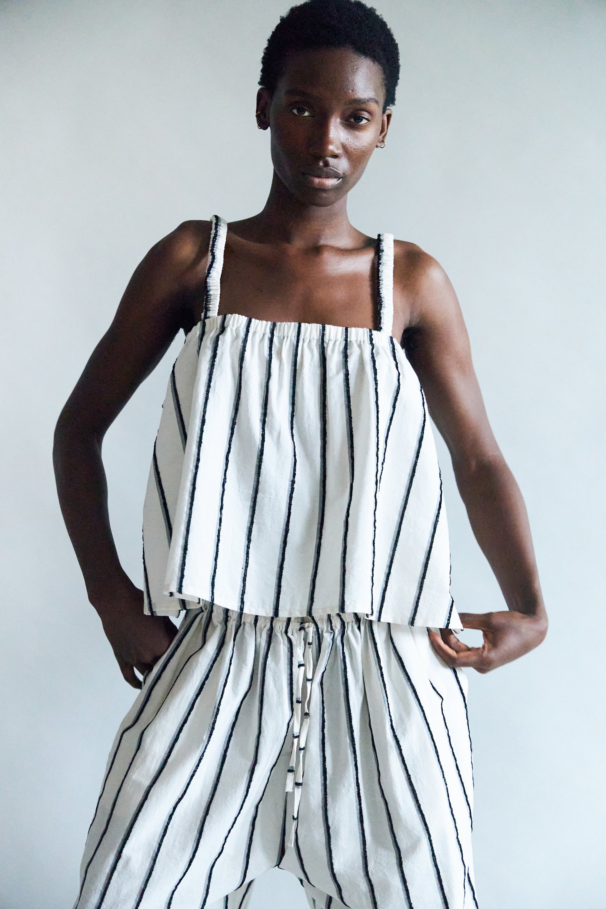 Alis is a light camisole top with a relaxed, feminine silhouette. Designed with elasticated straps and a softly gathered neckline, it falls loosely over the body for an effortless summer feel. Crafted with tennis stripes, the fabric blends cotton and rayon, giving it a soft hand feel.