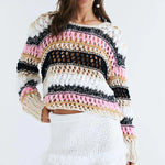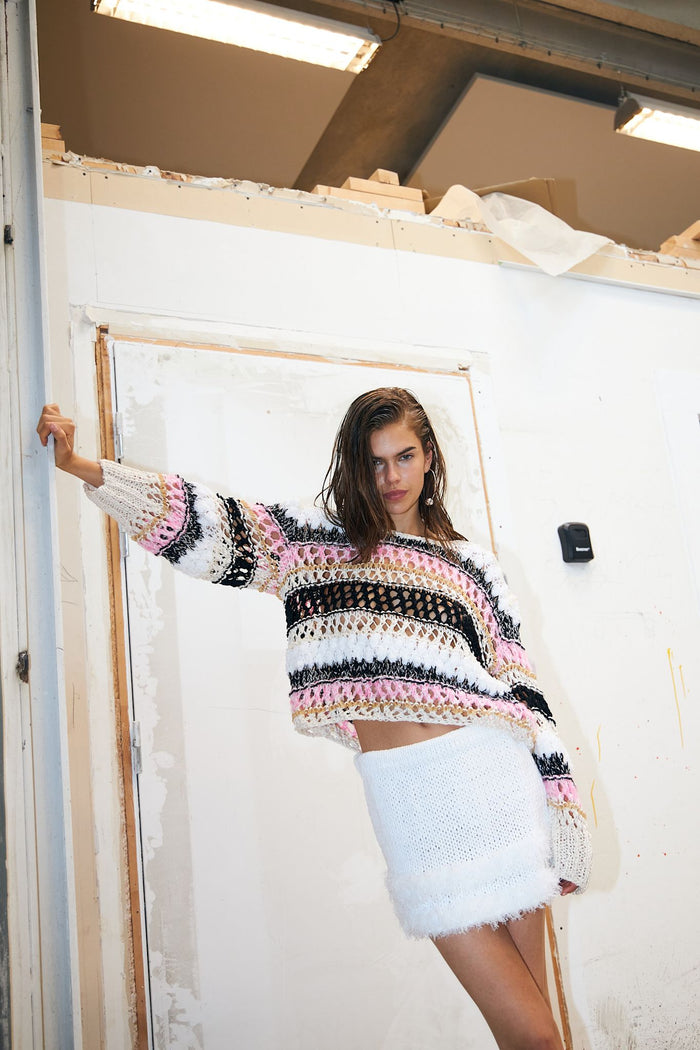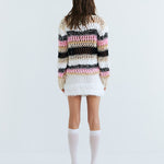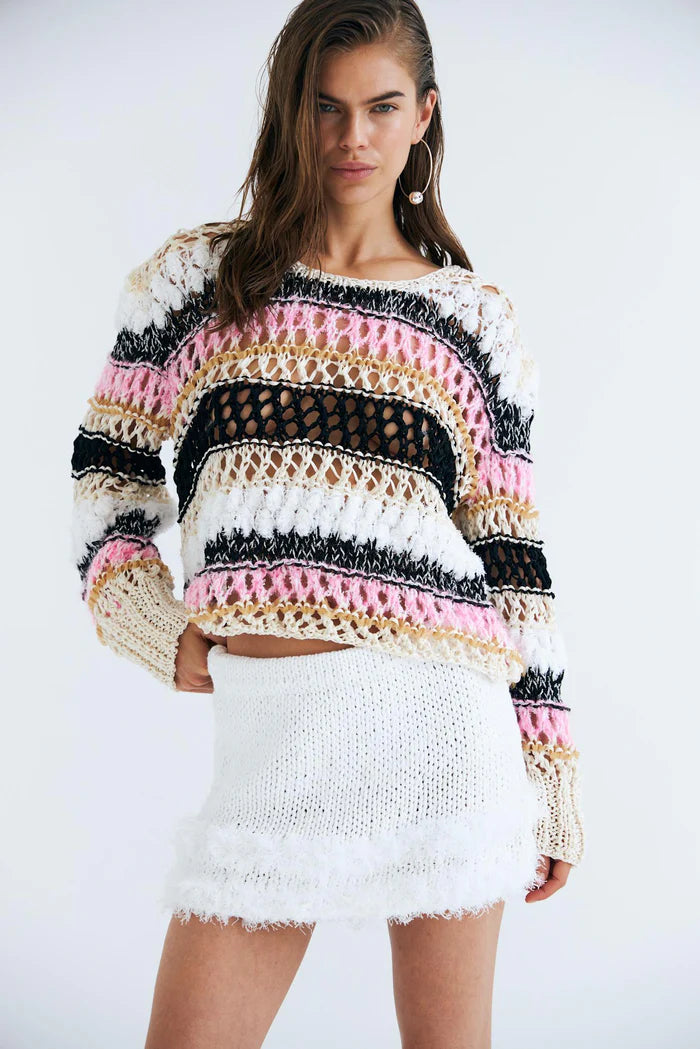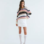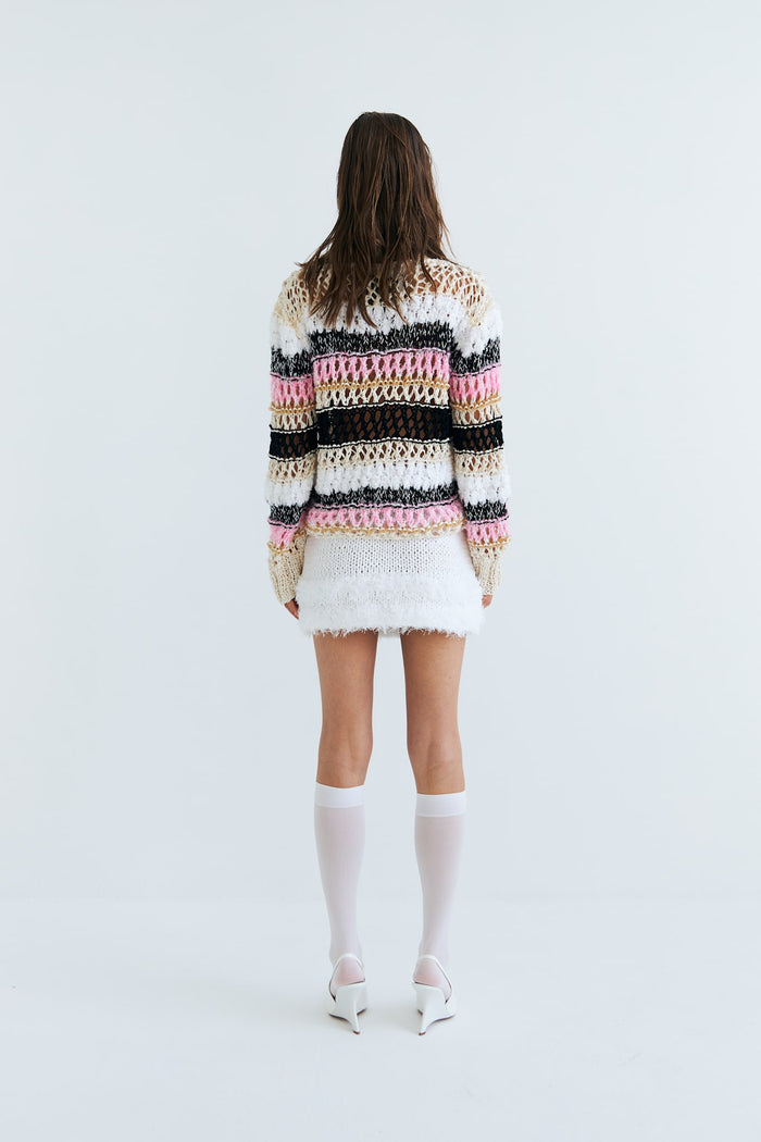 ELOISE is a hand knitted cotton mohair pointelle pullover with decorative openwork pattern created through holes in the knitting. The knitwear has a light and airy texture with a mix of yarn in clear colour stripes.