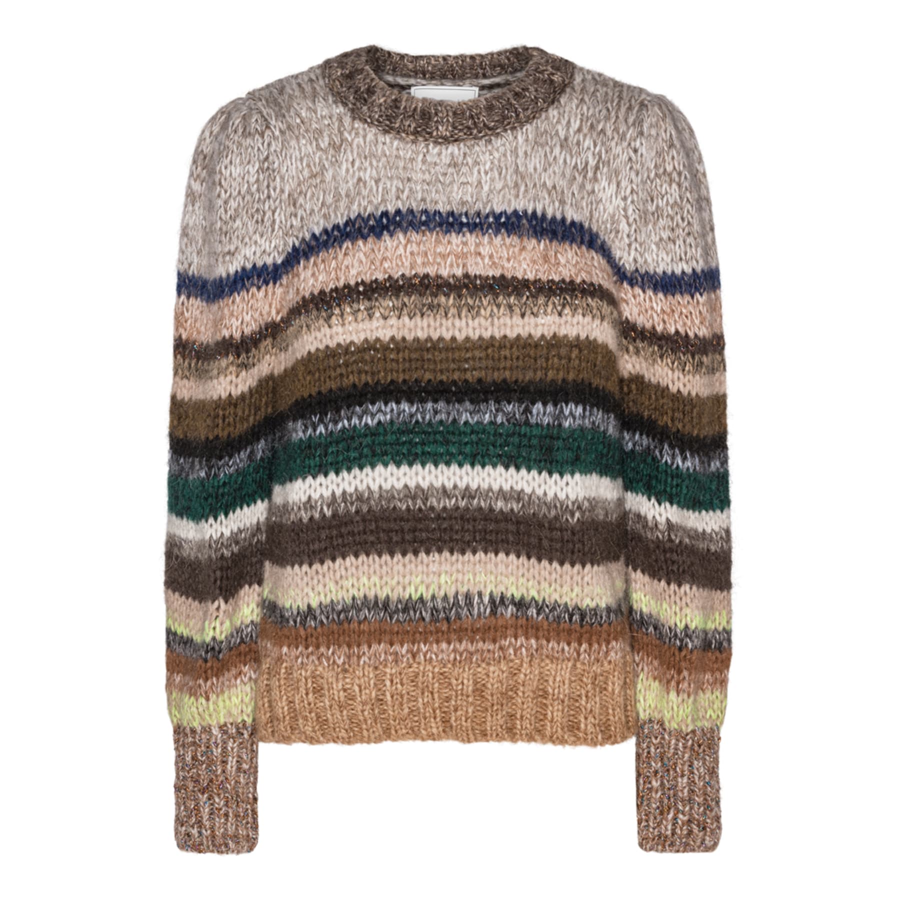 FIFI MULTI has multi colour stripes in earthy tones, crew neck and broad ribs at sleeves. The knit has slightly puffed shoulders. It can easily be worn with jeans, a skirt or over a dress.