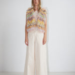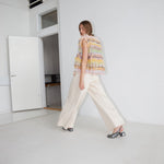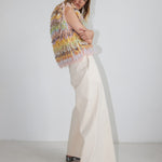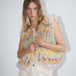 The FONDA KNITTED GILET is hand knitted with the yarn creating all-over fringes. Come in a multi pastel stripe. Dawn x Dare only use certified mohair yarns of Italian origin.
