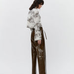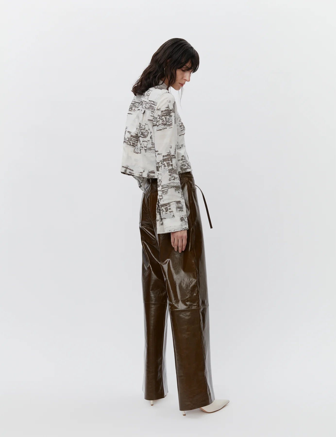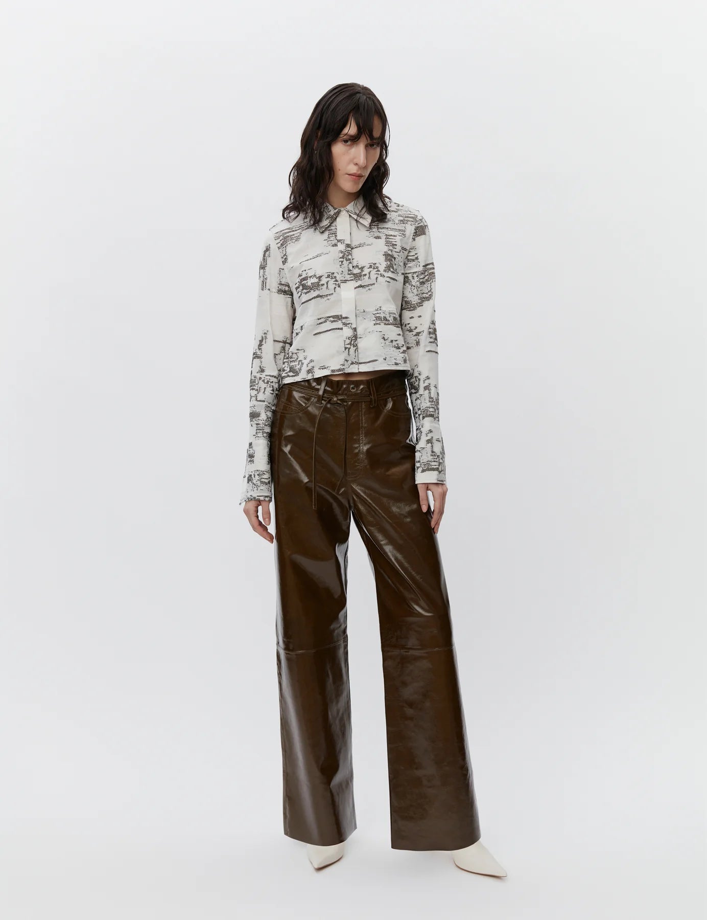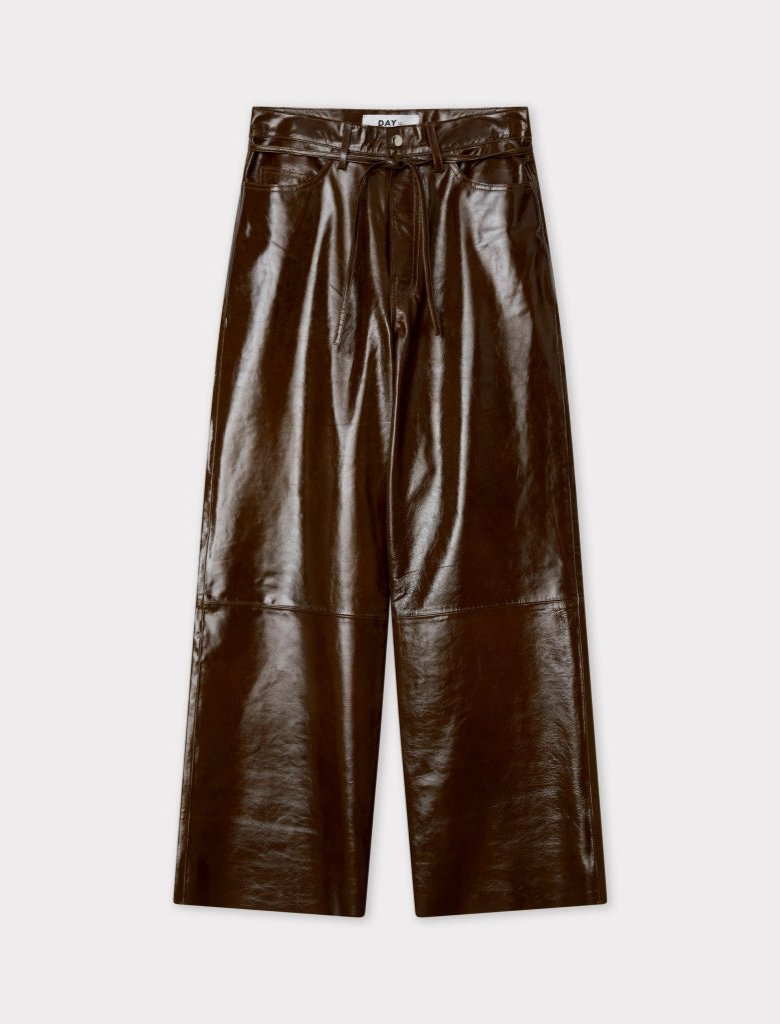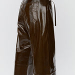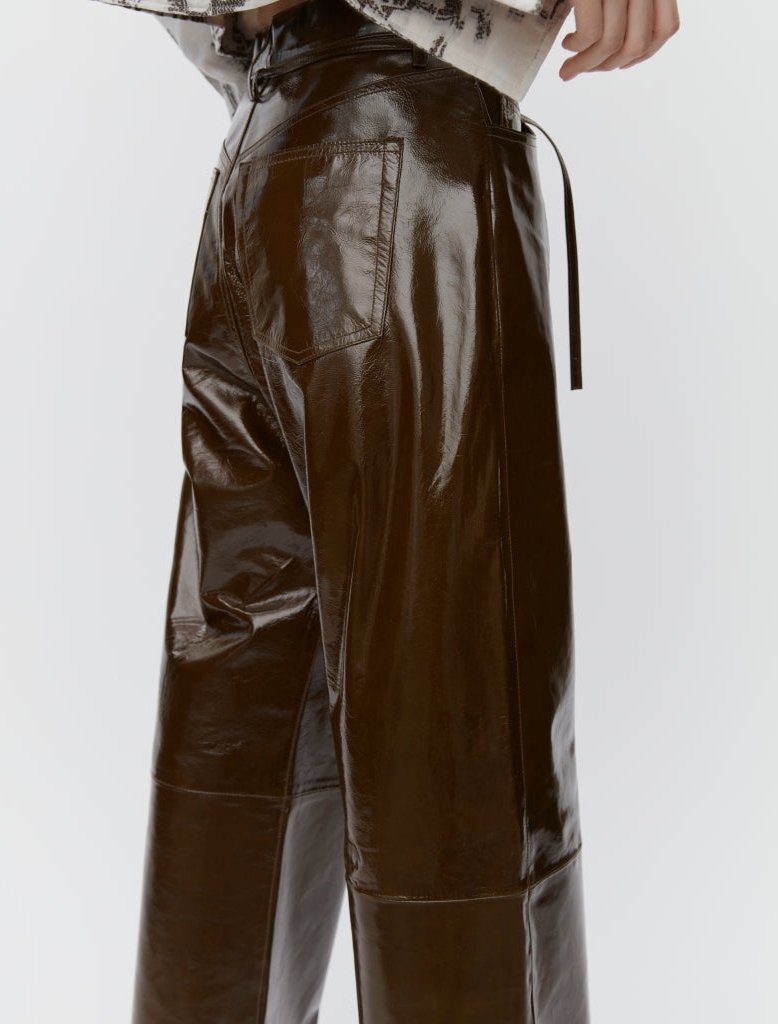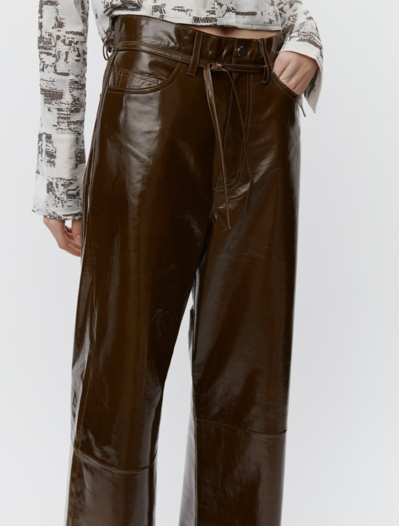 Straight-leg leather trousers with five pockets, a zip fly with button closure, and a removable tie belt at the waist. They are low rise with a loose fit.