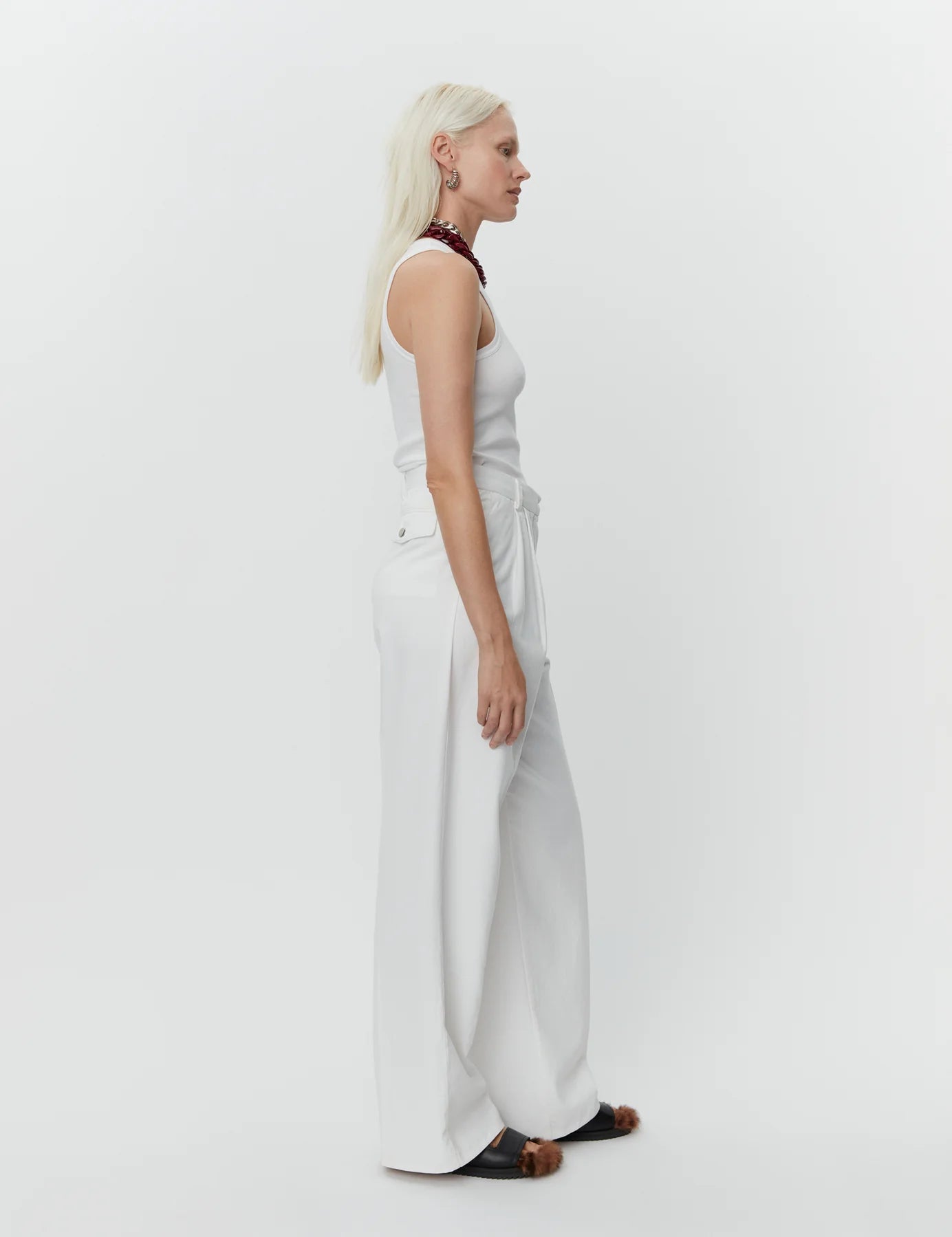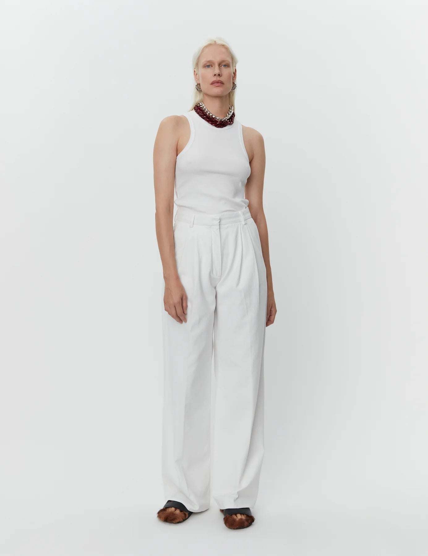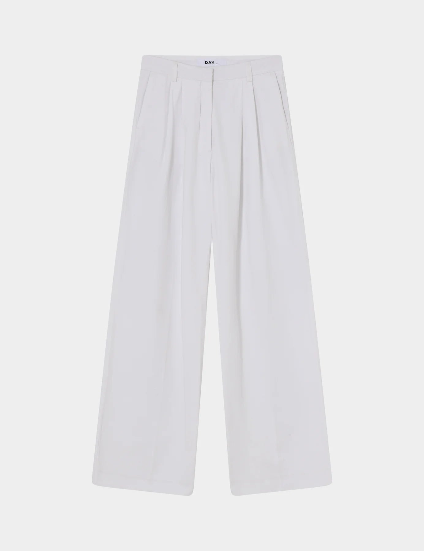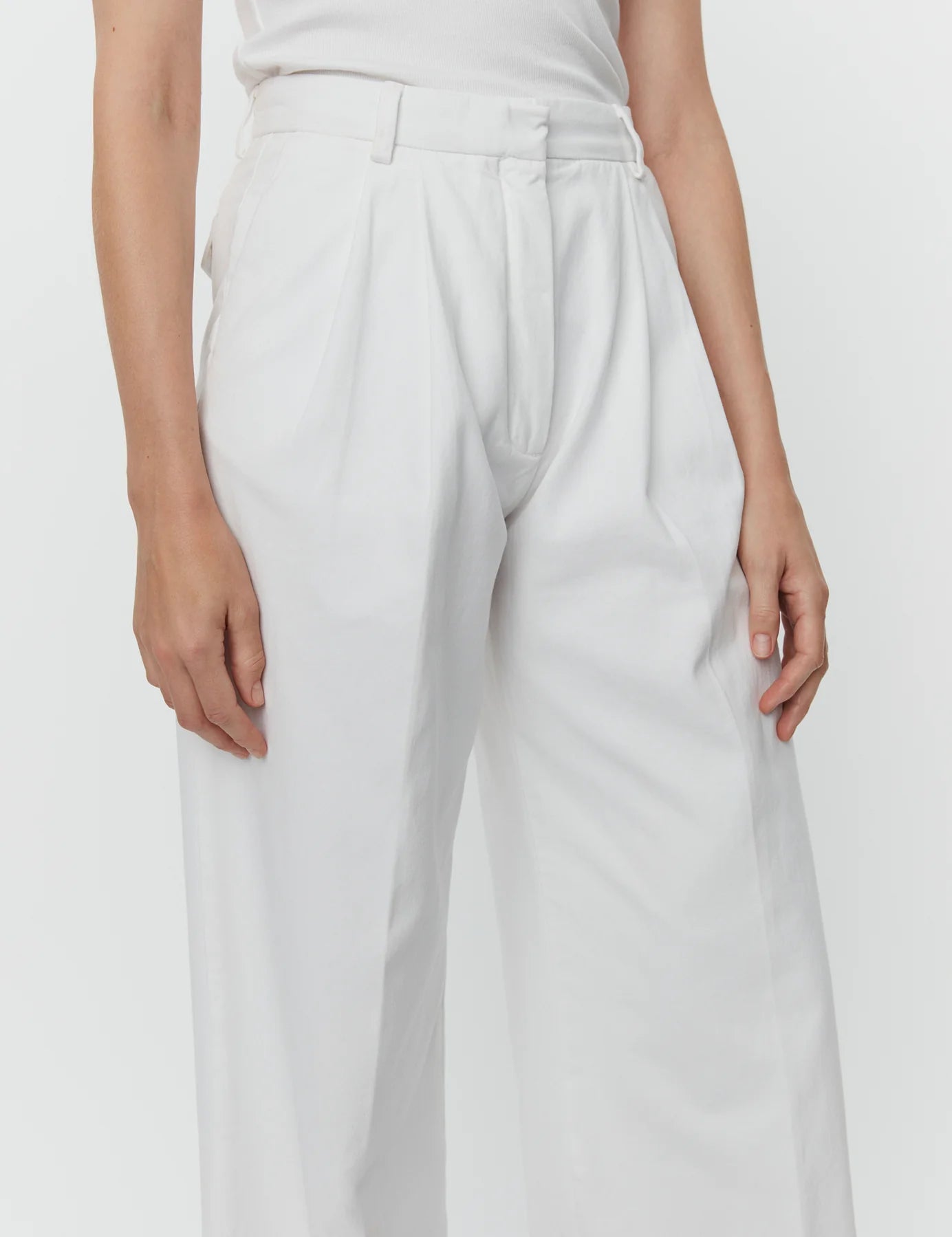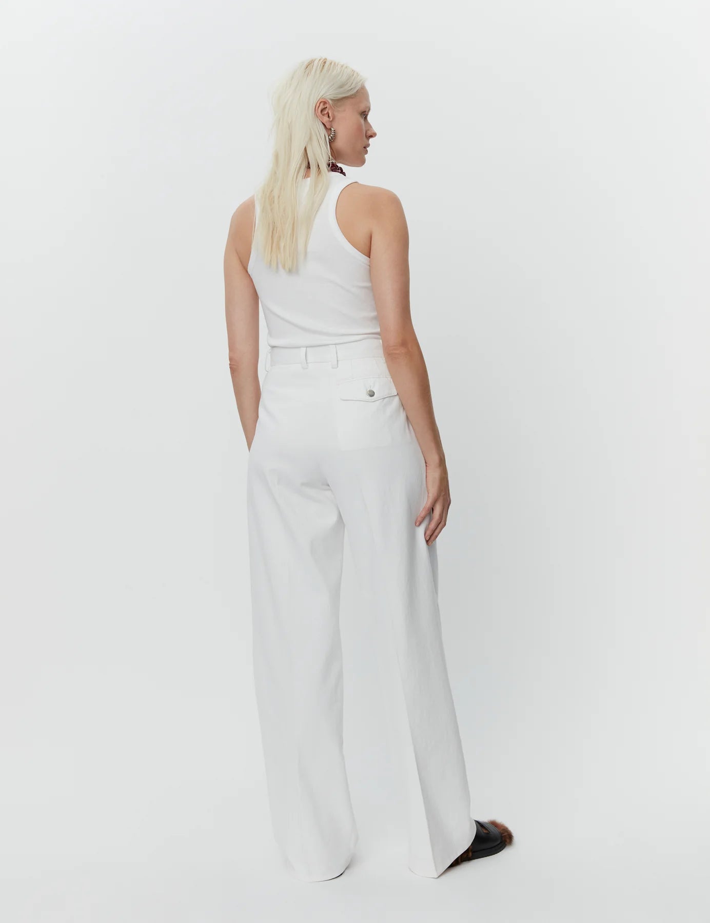 These high-rise, wide-leg trousers have pleats at the waist, a zip fly with hook closure, and side pockets. There is a single patch pocket in the back. These trousers have a regular fit.