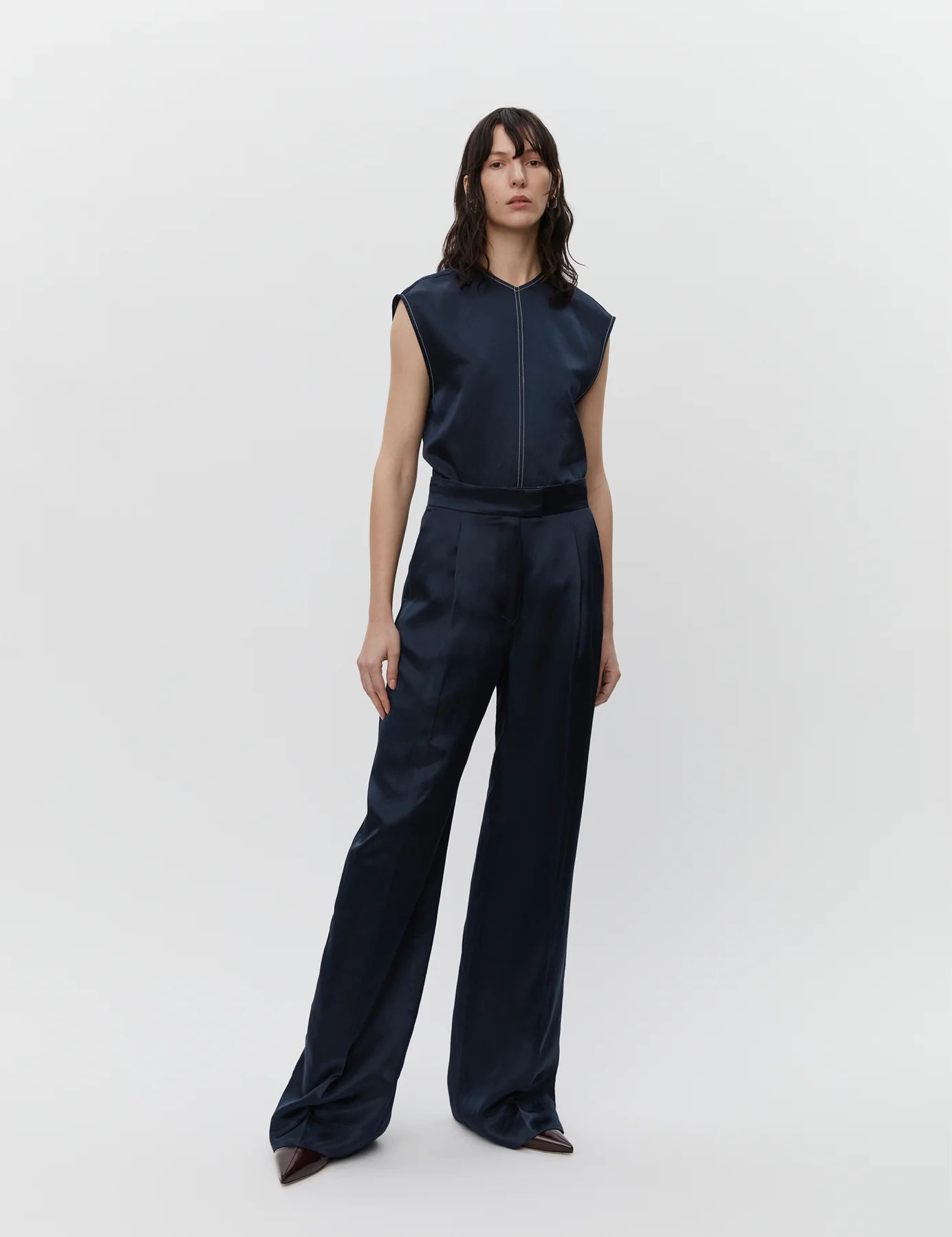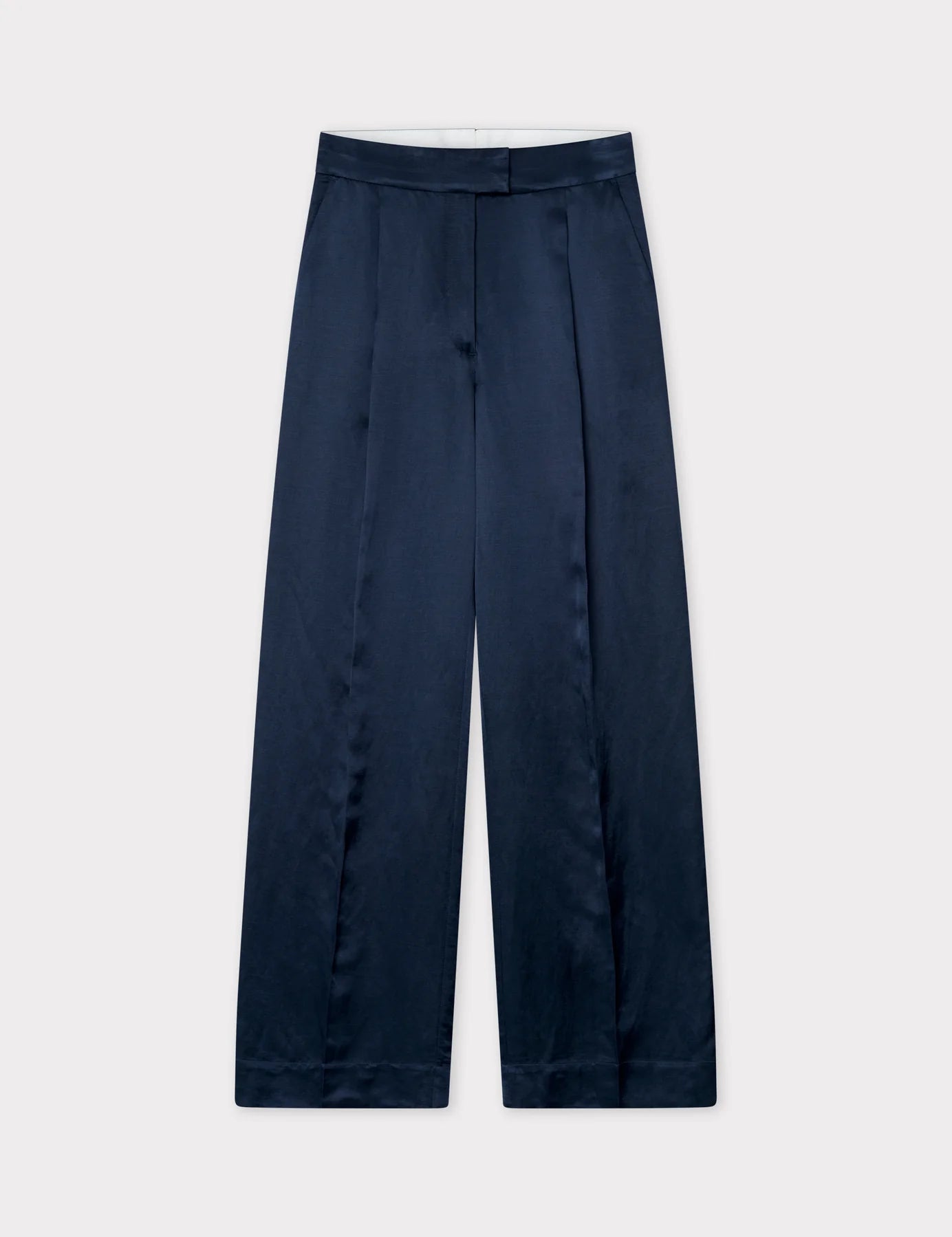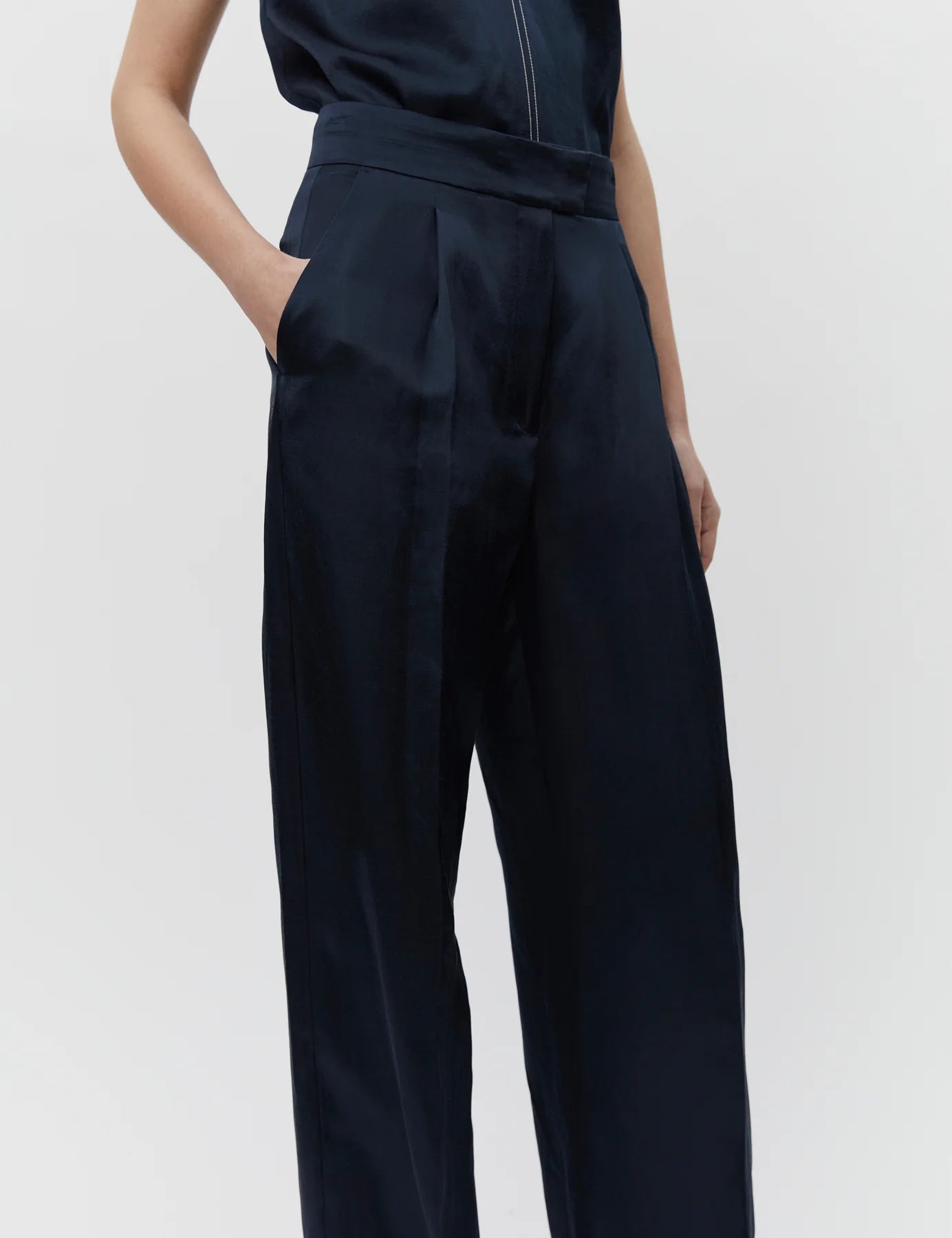 These mid-rise, wide-leg trousers feature a zip fly with hook closure, side pockets, and pockets in the back. There are pleats at the waist. The trousers have a regular fit.