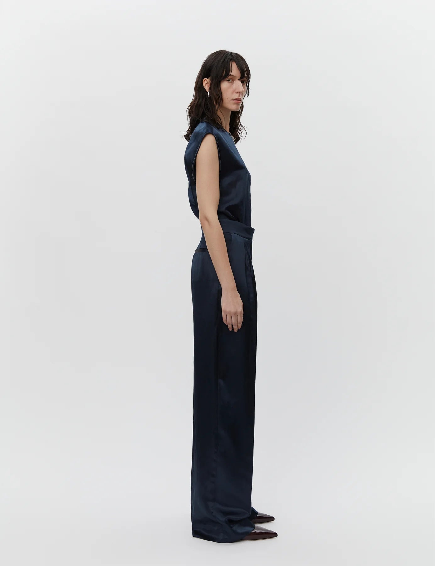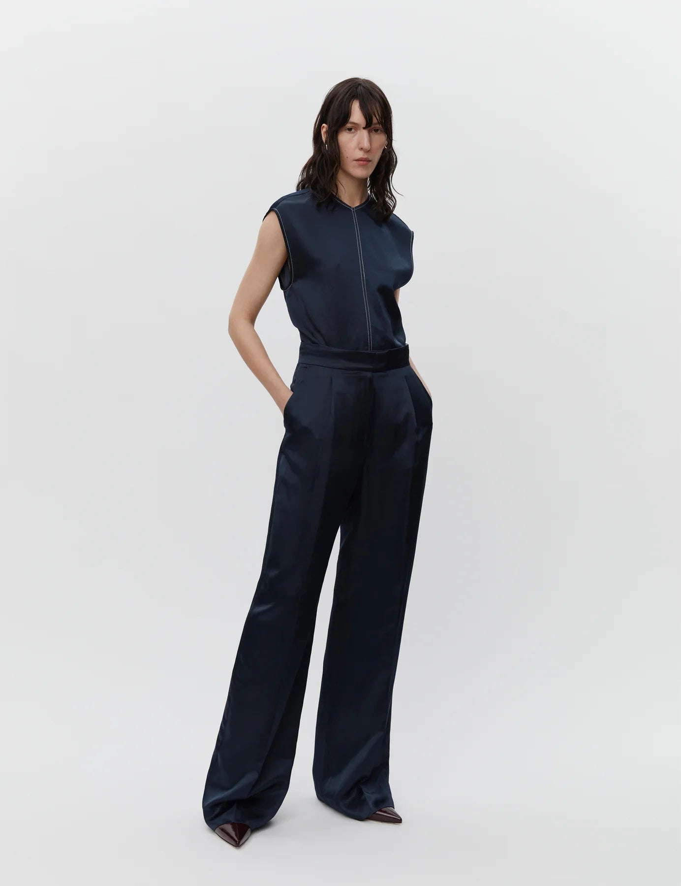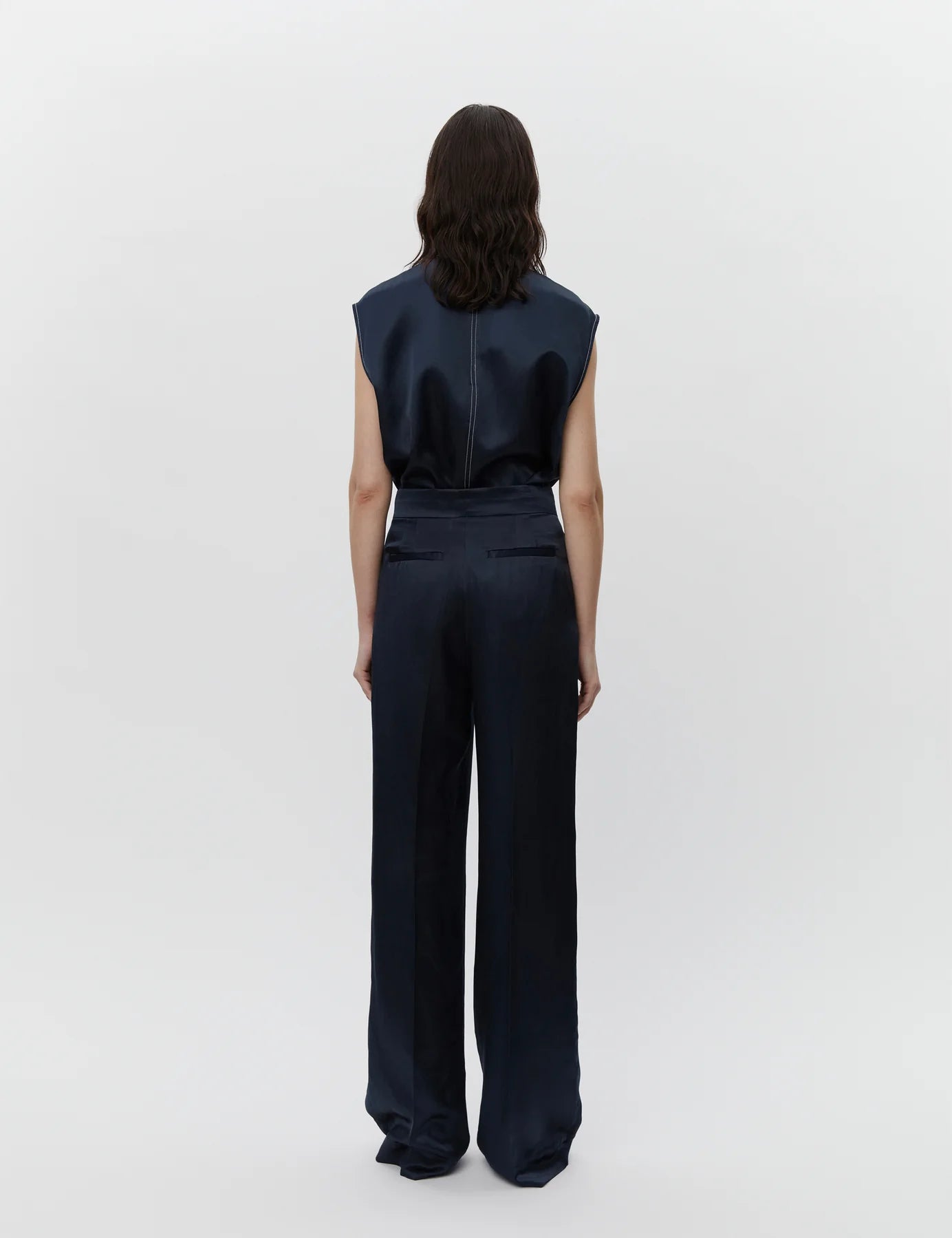 These mid-rise, wide-leg trousers feature a zip fly with hook closure, side pockets, and pockets in the back. There are pleats at the waist. The trousers have a regular fit.