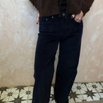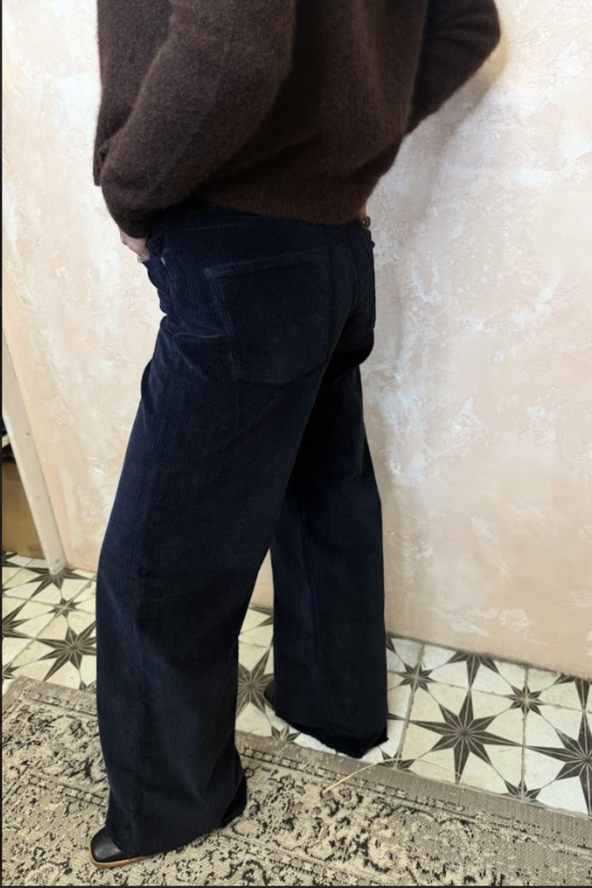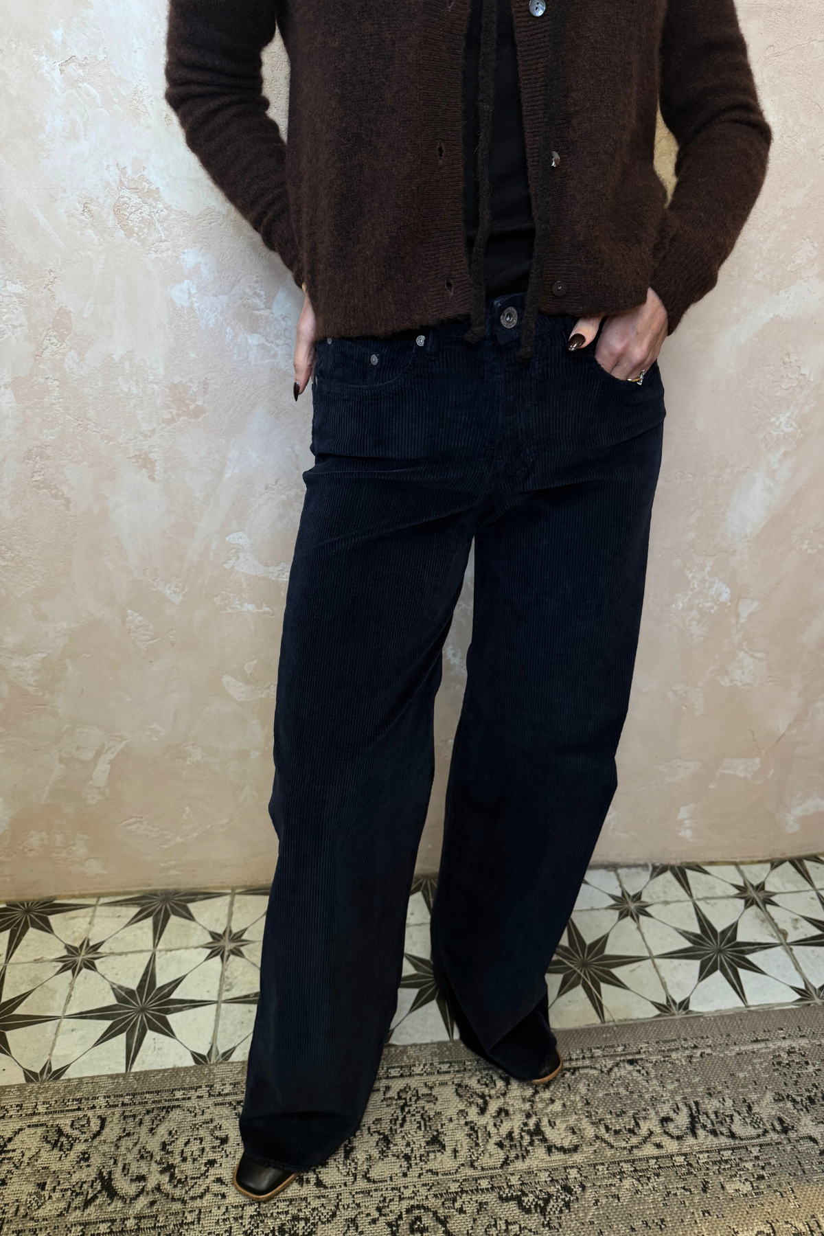 Wide leg trousers in navy corduroy. Zip and button closure with classic 5 pocket design.