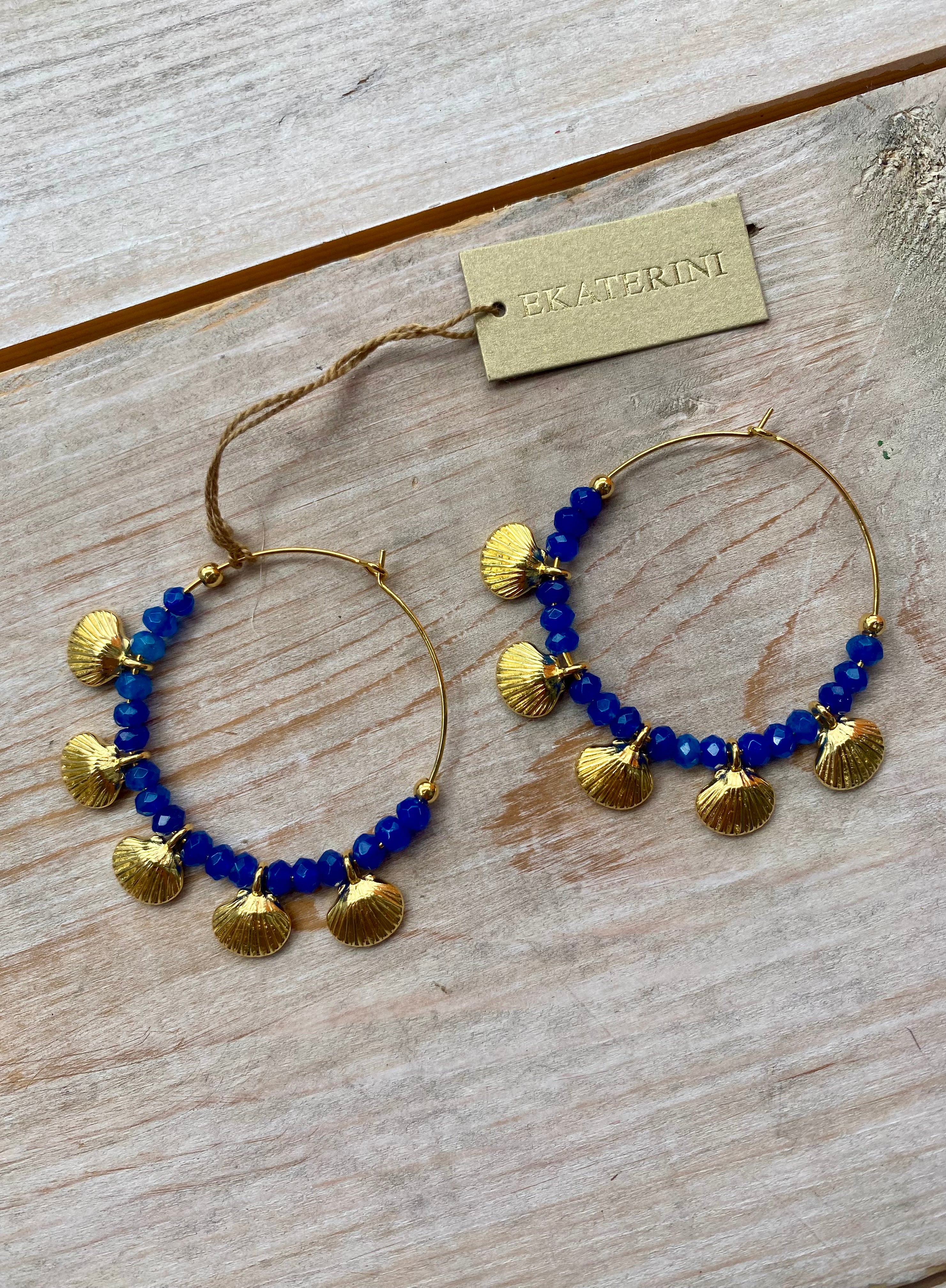 Hoop earrings with cobalt blue beads and golden shell pendants. Wear them with the matching Atlantic Ocean Necklace for the full look.