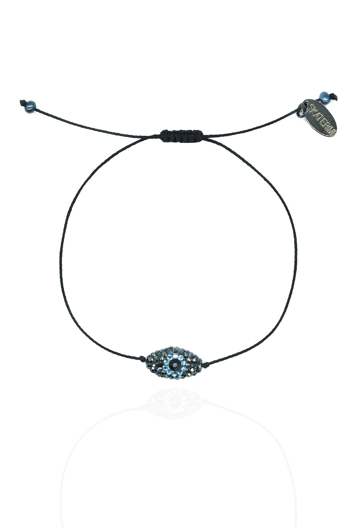 String bracelet in black with a shimmery, beaded evil eye in black and blue. The adjustable wrist band makes it easy to wear and style with other bracelets for a bohemian summer look.