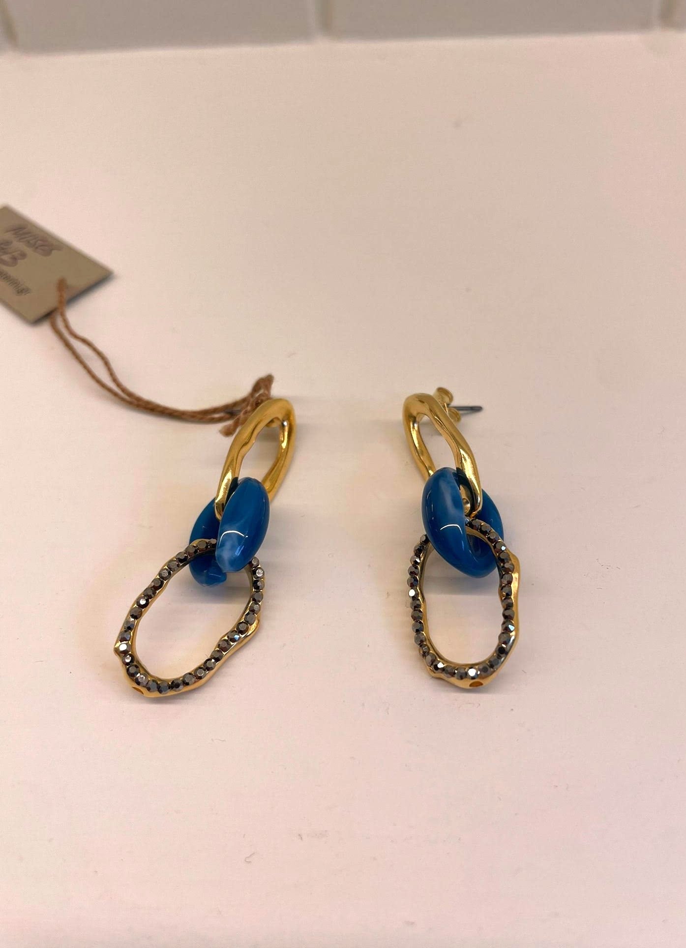 Mid sized earrings with ear stud design. These dynamic pair has a golden, a blue and a crystal embellished link all interconnected to create a timeless style.