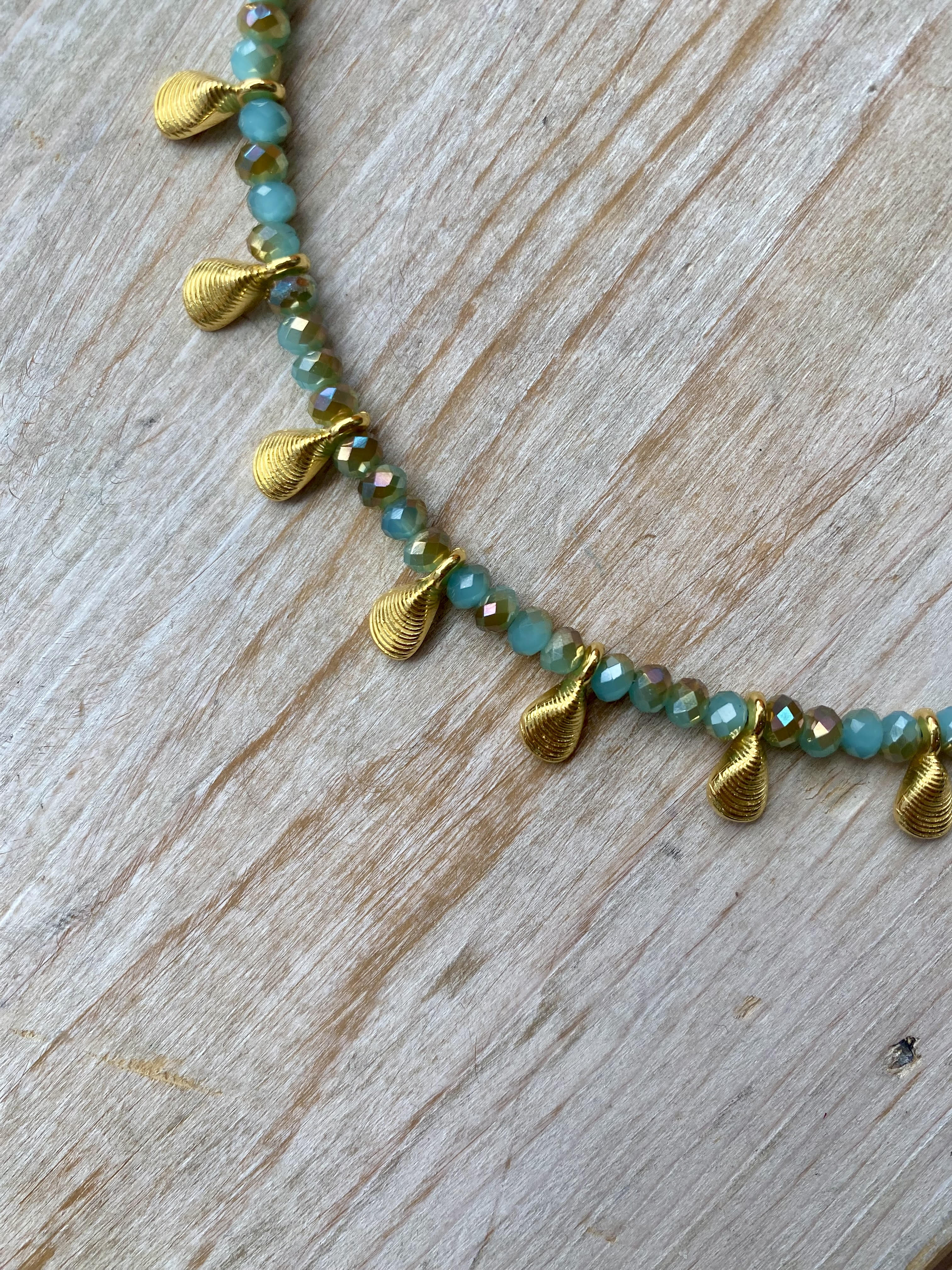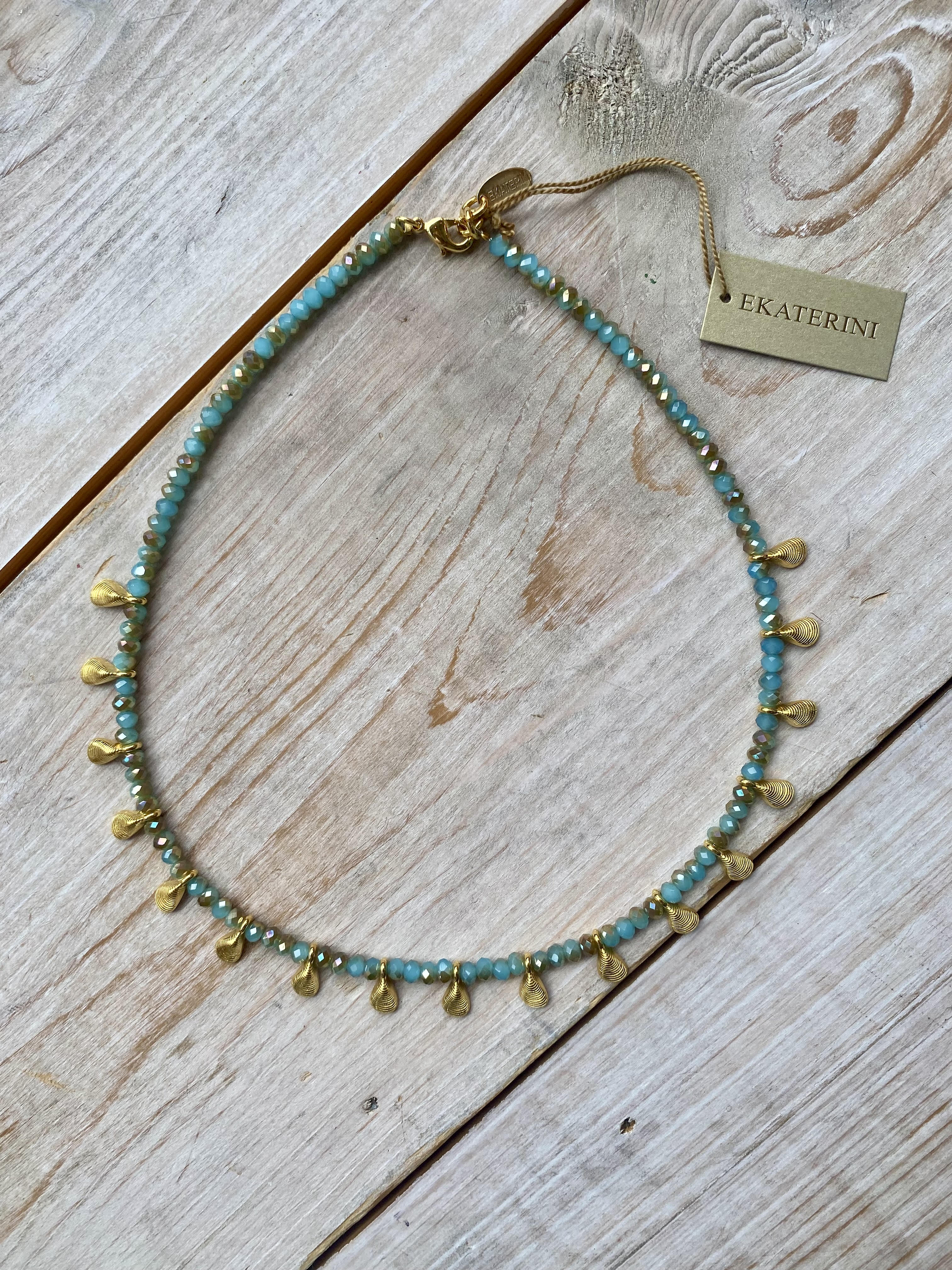 Short necklace in turquoise beads and golden muscle pendants. Wear it with the matching Pacific Ocean Hoop Earrings for the full look.