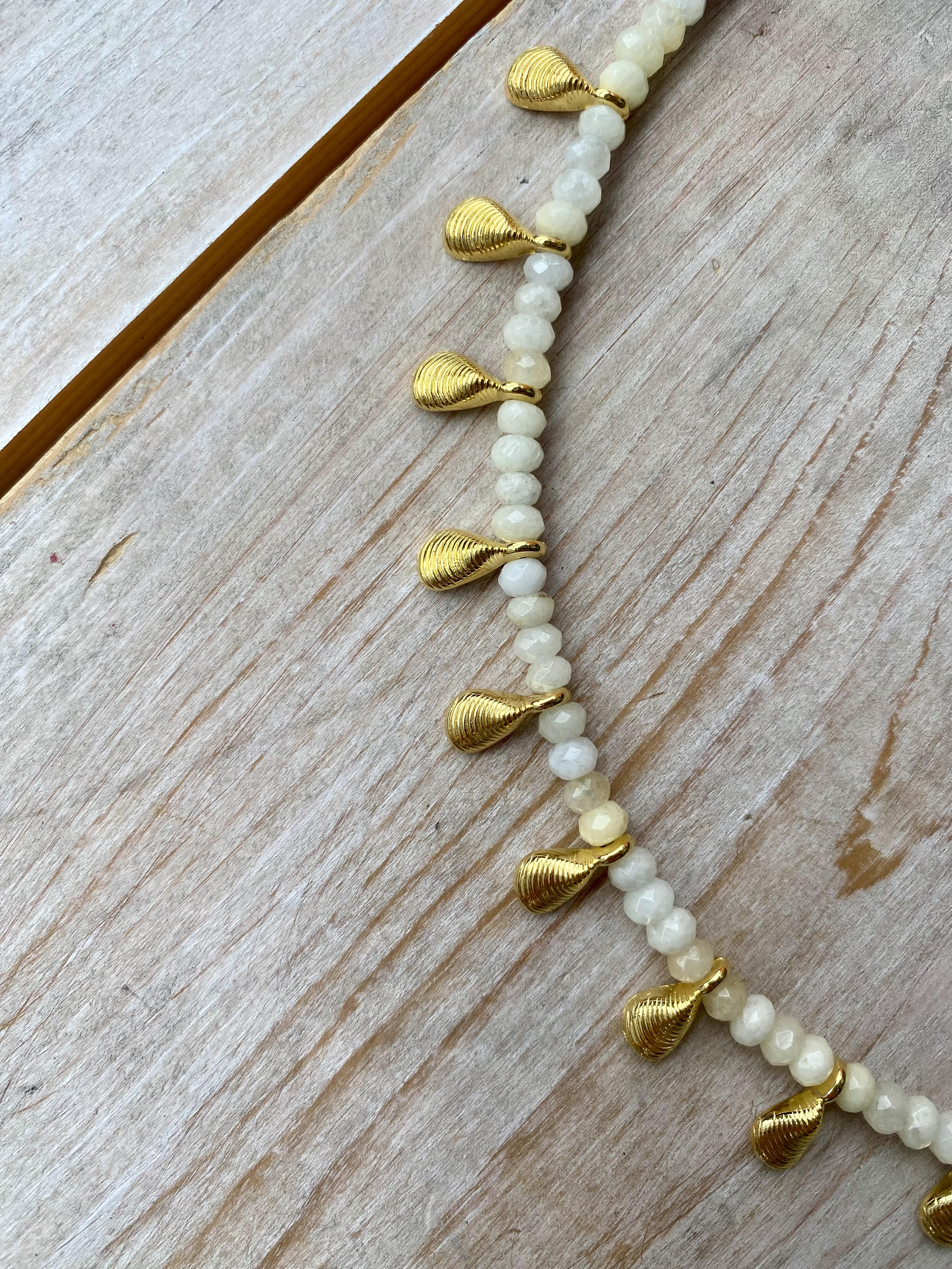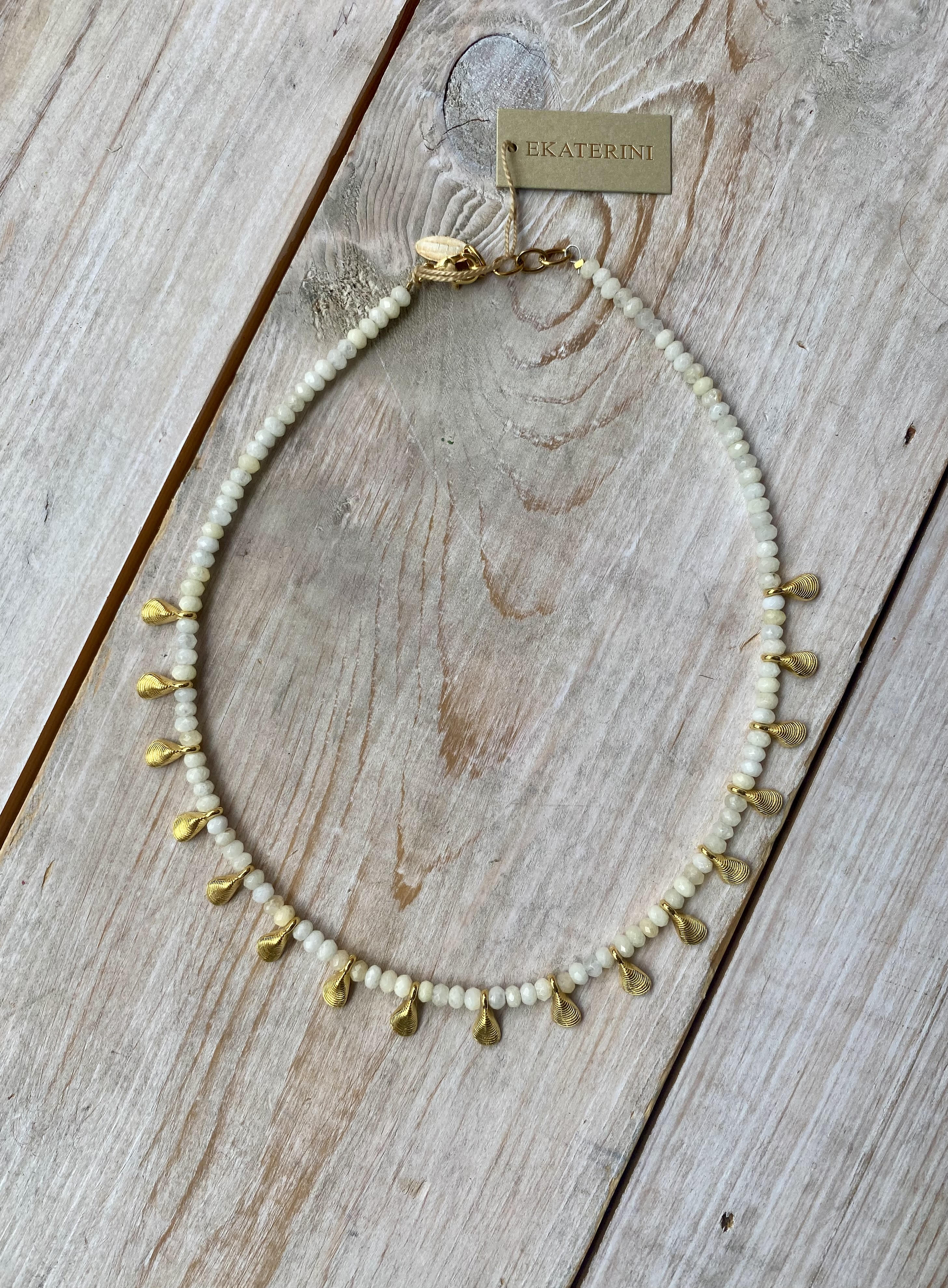Short necklace in white beads and golden muscle pendants. Wear it with the matching Pacific Ocean Hoop Earrings for the full look.