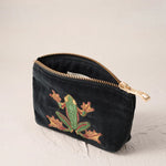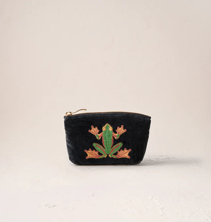 Jump-start your daily routines or make a playful statement with this embroidered frog design, featuring striking jade and gold threads against a charcoal velvet base - perfect for those who are always on the move.