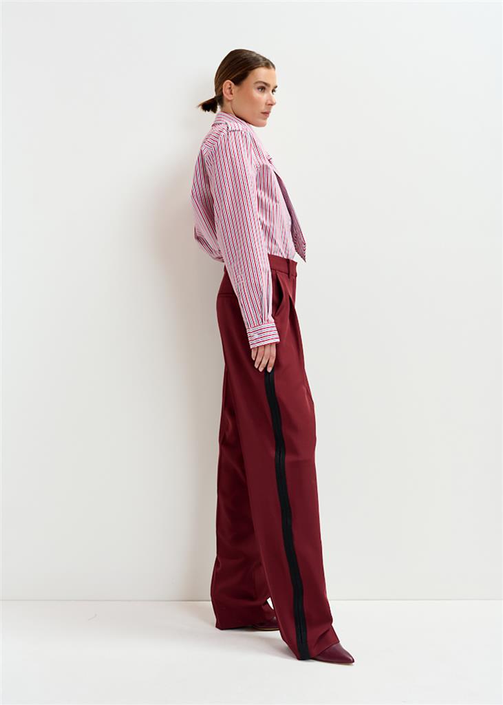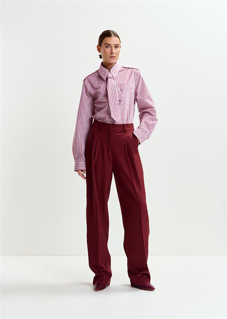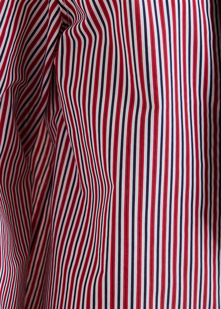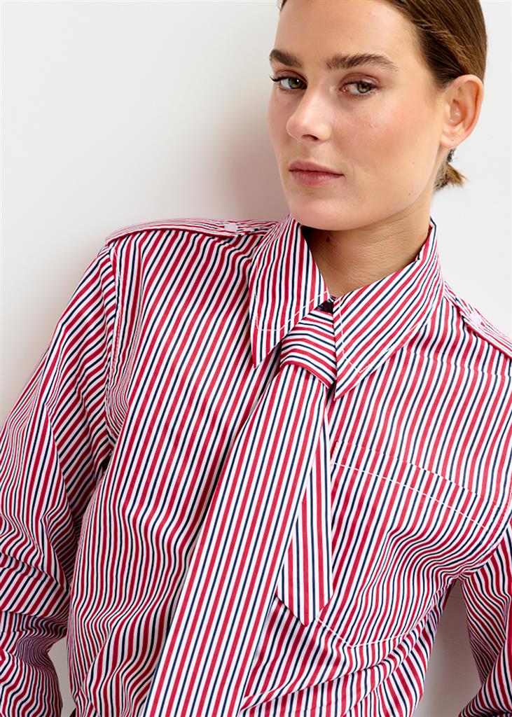 Boxy shirt is a playful take on a classic wardrobe staple. Crafted from a cotton-blend fabric, it’s designed with dropped shoulders and a gently rounded hemline. A single chest pocket and button fastening keep the silhouette timeless, while a removable bow tie adds a touch of charm. Shoulder straps with button detailing add a subtle utilitarian edge, enhancing the laid-back yet refined feel. Perfect for styling tucked, untucked, or layered, this shirt blends versatility with a refined twist.