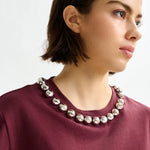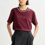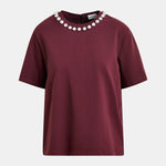 Cotton T-shirt cut for a boxy, relaxed silhouette, it features short sleeves and a clean round neckline adorned with oversized metallic pearl-style embellishments for an elevated twist. A concealed zip at the back adds a polished finish. Wear it tucked into tailored pants or let it elevate your go-to denim.