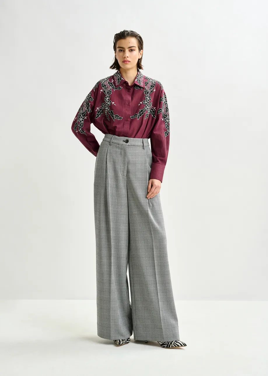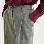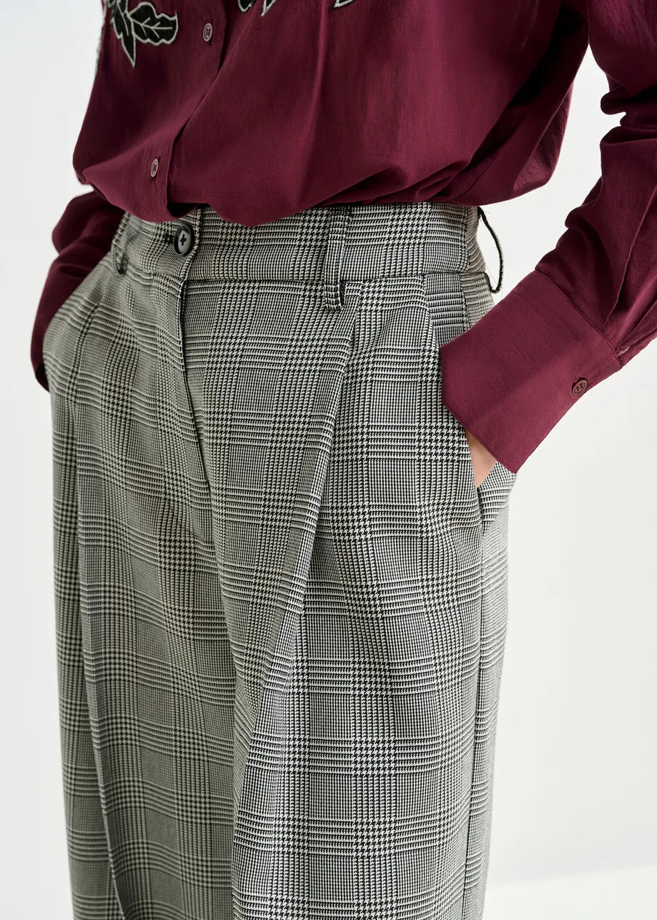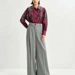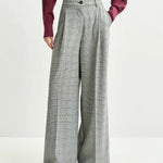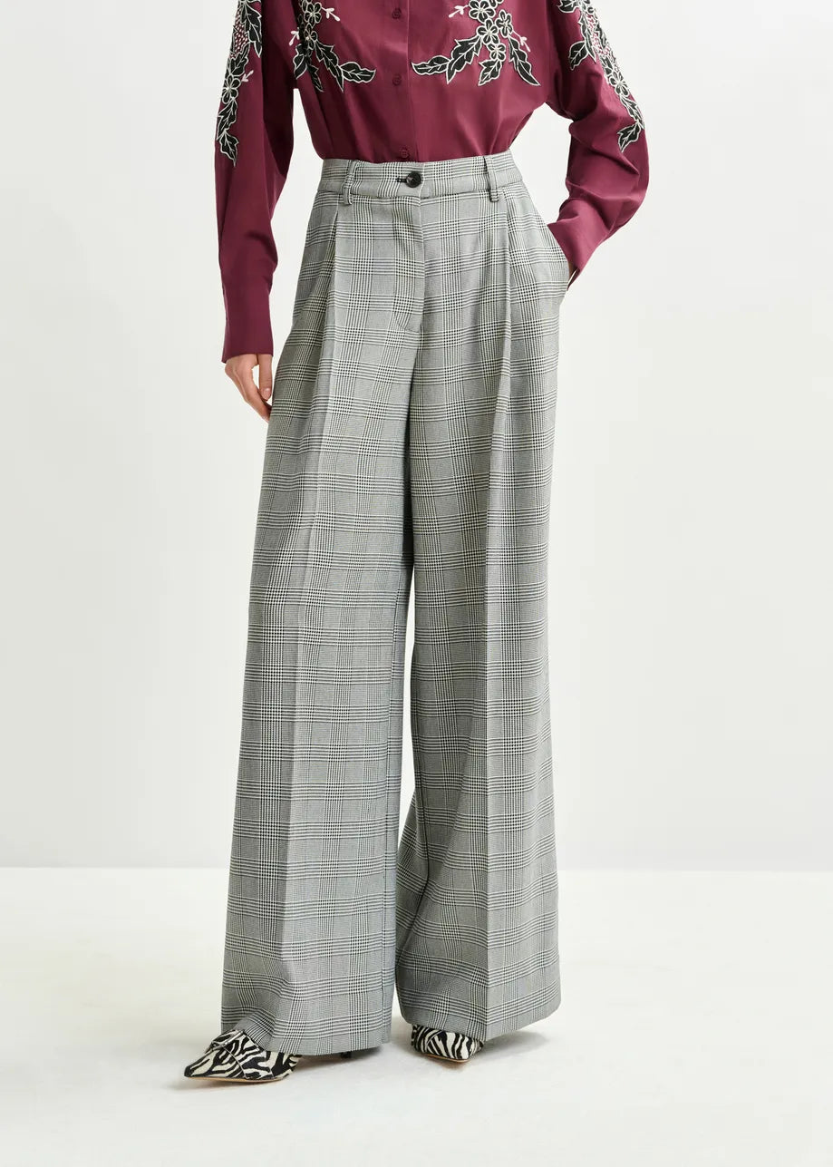 Elegantly designed trousers with pleats at the waist that cascade into soft folds along the pooling wide-leg silhouette. They are completed with slanted front pockets, two welt pockets at the back, a zip and button fastening, and pressed creases at the front and back for a polished finish. Style with a tucked-in blouse and heeled boots to highlight the high waist or add a statement belt for a tailored look.
