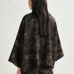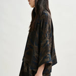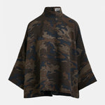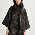 Kimono-like, oversized top is designed with a stand-up collar, hidden zip fastening at the back and wide 3/4 length sleeves. It is made from a recycled polyester-stretch blend fabric, woven with a subtly textured finish, blending comfort with style seamlessly.