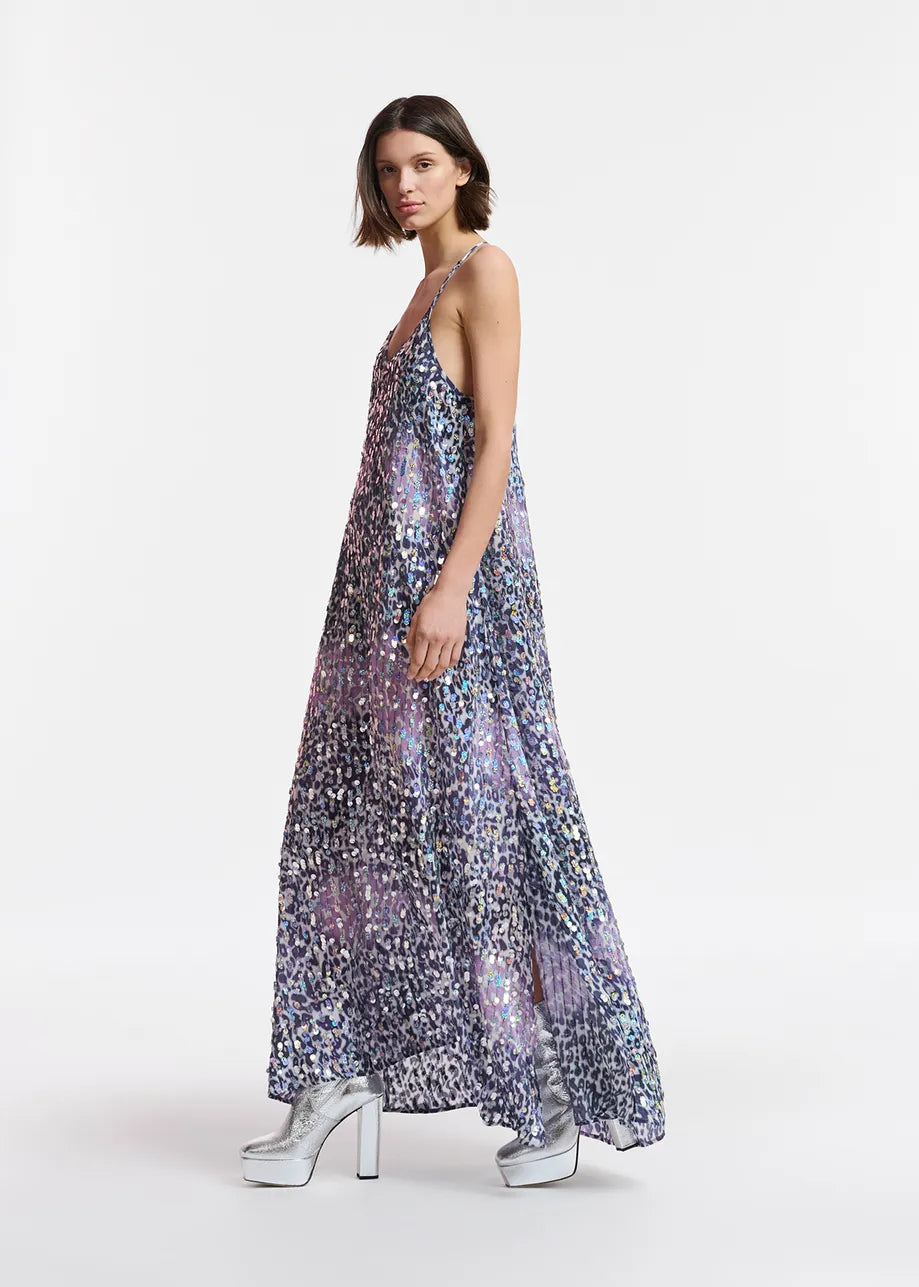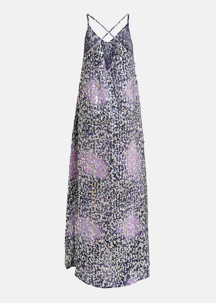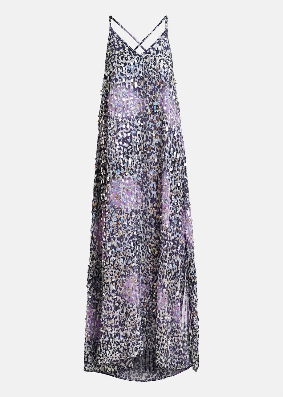 Falling to an ankle-grazing length, this slip dress is made from a lightweight viscose fabric dappled in leopard spots and embellished all-over with shimmering sequins. The thin shoulder straps cross at the back and are adjustable in length to find your perfect fit.
