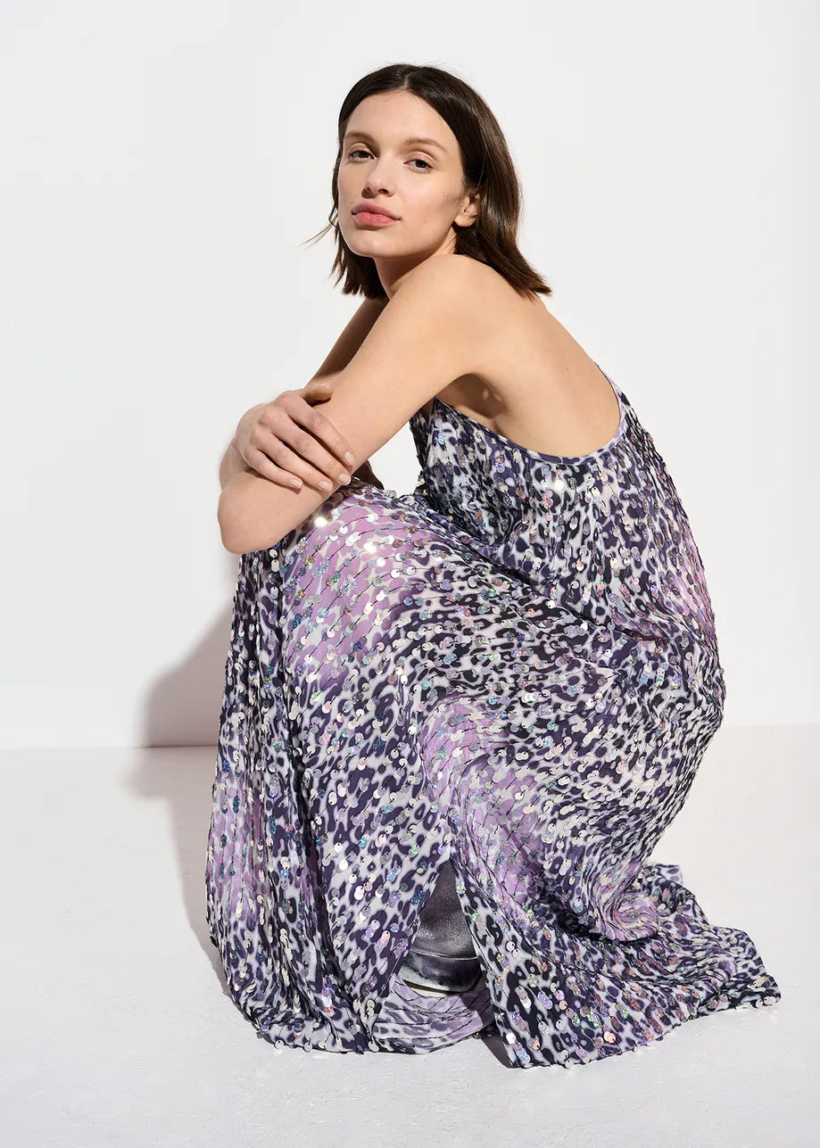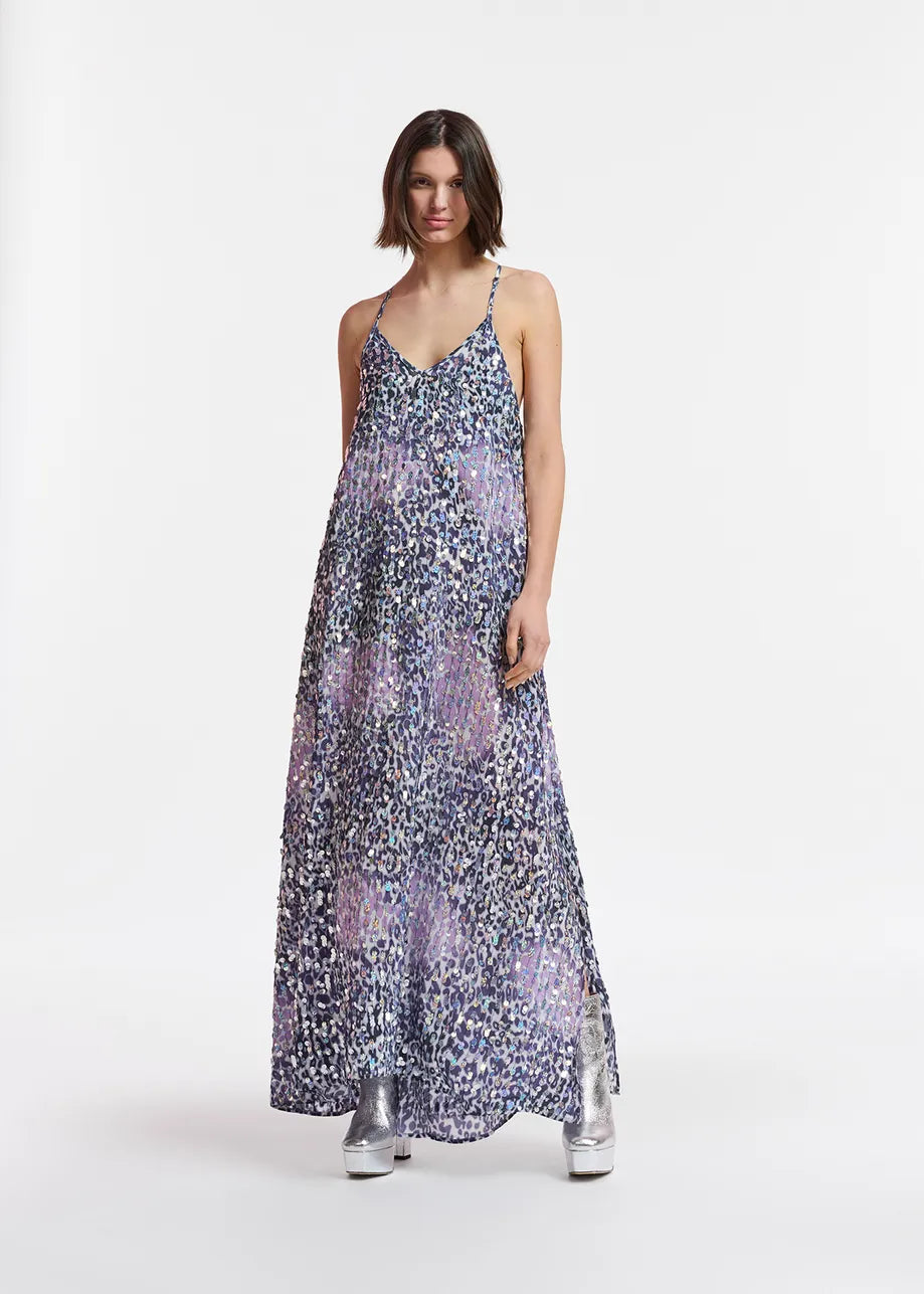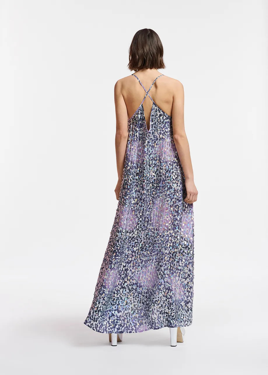Falling to an ankle-grazing length, this slip dress is made from a lightweight viscose fabric dappled in leopard spots and embellished all-over with shimmering sequins. The thin shoulder straps cross at the back and are adjustable in length to find your perfect fit.