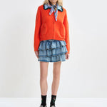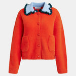Cardigan in a tactile finish, designed with a button-front closure and two patch pockets. The look is defined by a contrasting colour knit collar, accented with a colourful ruffle border for added definition and texture.
