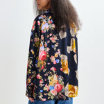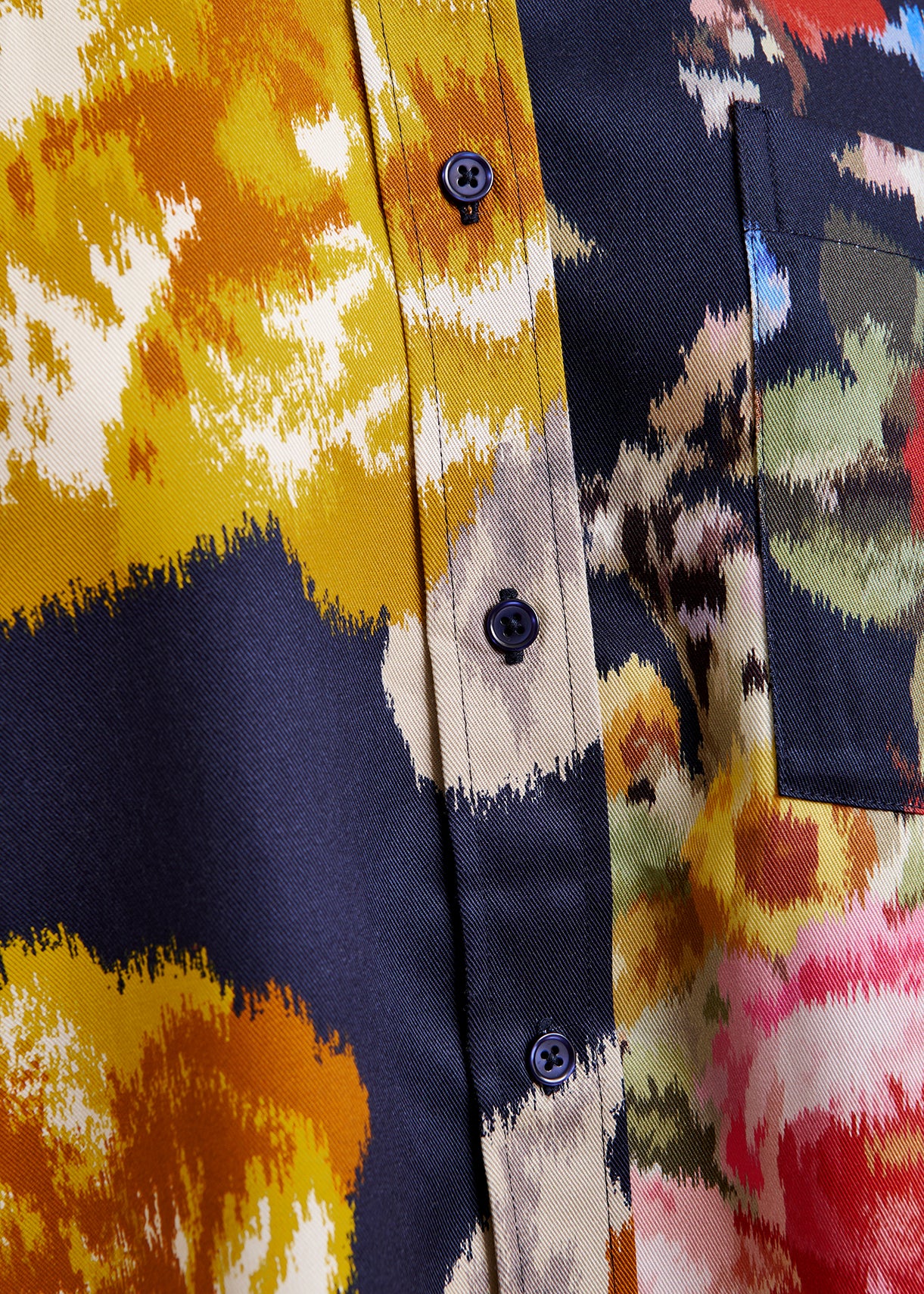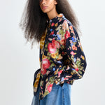 Cut from fluid fabric, this shirt comes cut from two different flower patterned textiles. Designed with one side in navy and mustard and the other in multicolours, you are sure to stand out in the crown. Super special piece.
