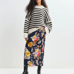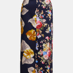 Maxi skirt features a relaxed fit and a high waist for effortless comfort, designed with slanted pockets and a hidden zip fastening. A side slit adds subtle movement, featuring contrasting floral prints on either side for a standout look.