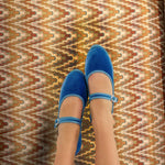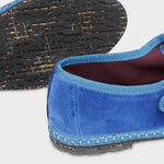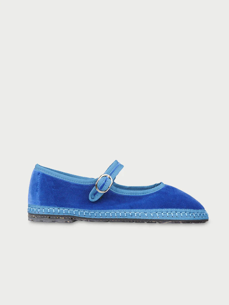 Velvet Mary Janes in blue with light blue piping and buckle closure.