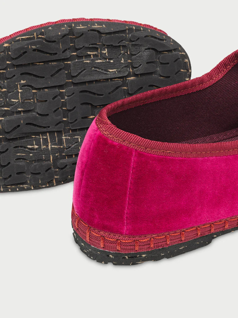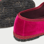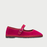 Velvet Mary Janes in fuchsia with matching piping and buckle closure.