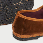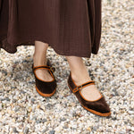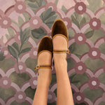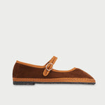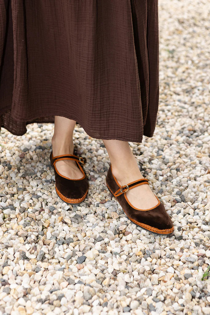 Velvet Mary Janes in brown with light brown piping and buckle closure.