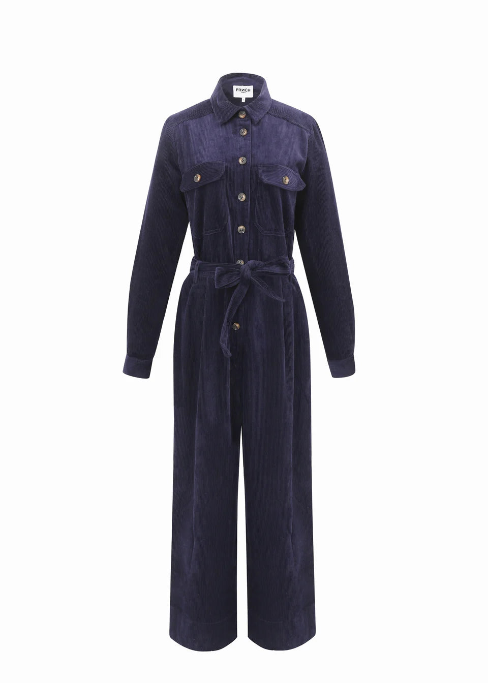 Corduroy jumpsuit with front button closure, chest pockets and collar. The sleeves are long with buttoned cuff and there's a tie belt to cinch in the waist.