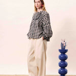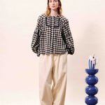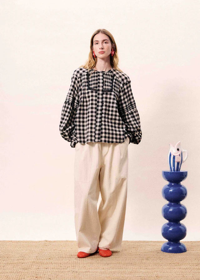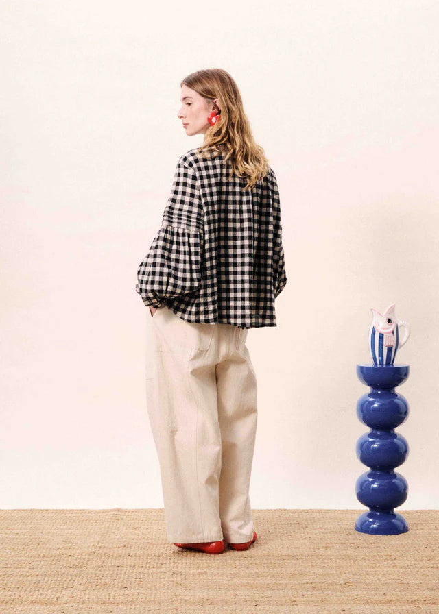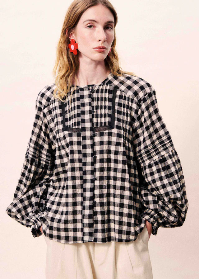 Black gingham checked blouse with pleated details and long, puff sleeves.