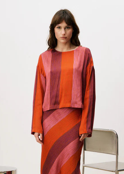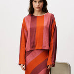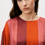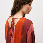 Silky, loose top with round neck and long sleeves. Gorgeously vibrant in red, purple and pink wide stripes and a open V back with tie strings.