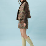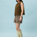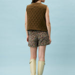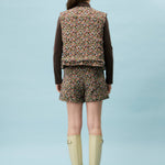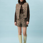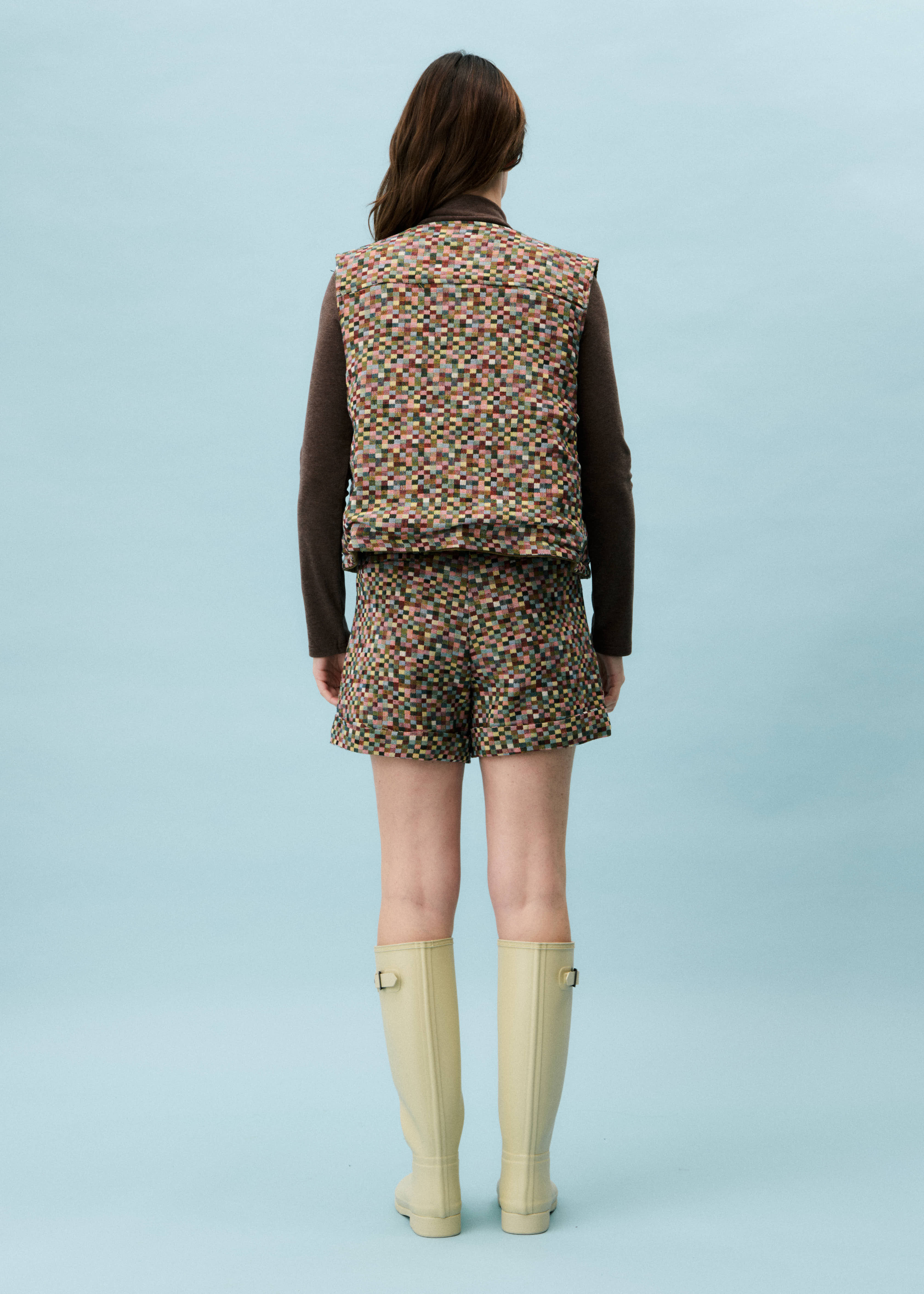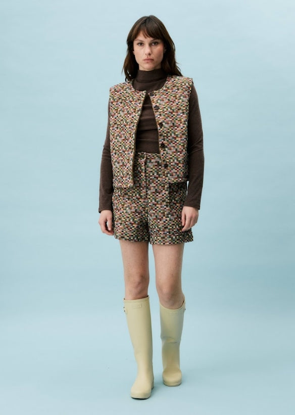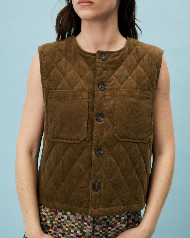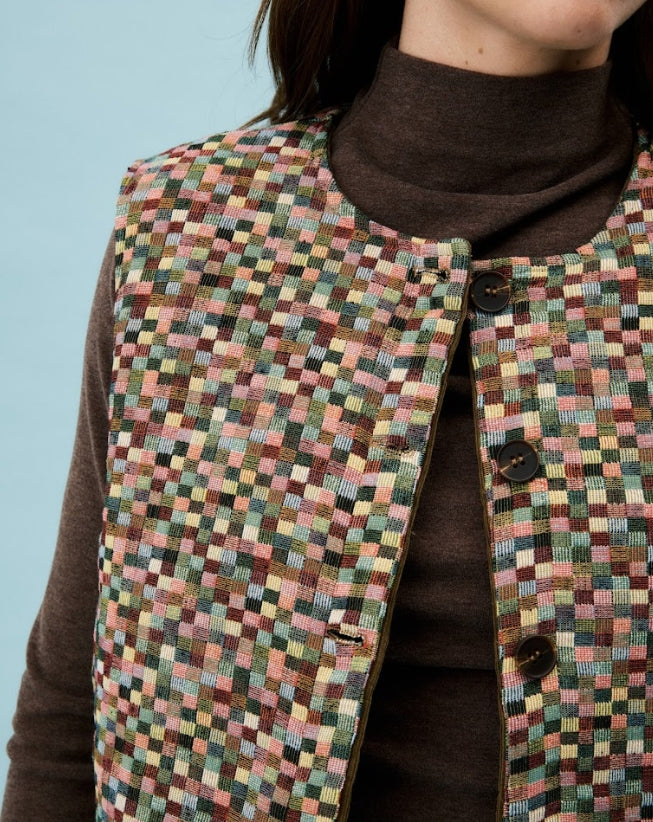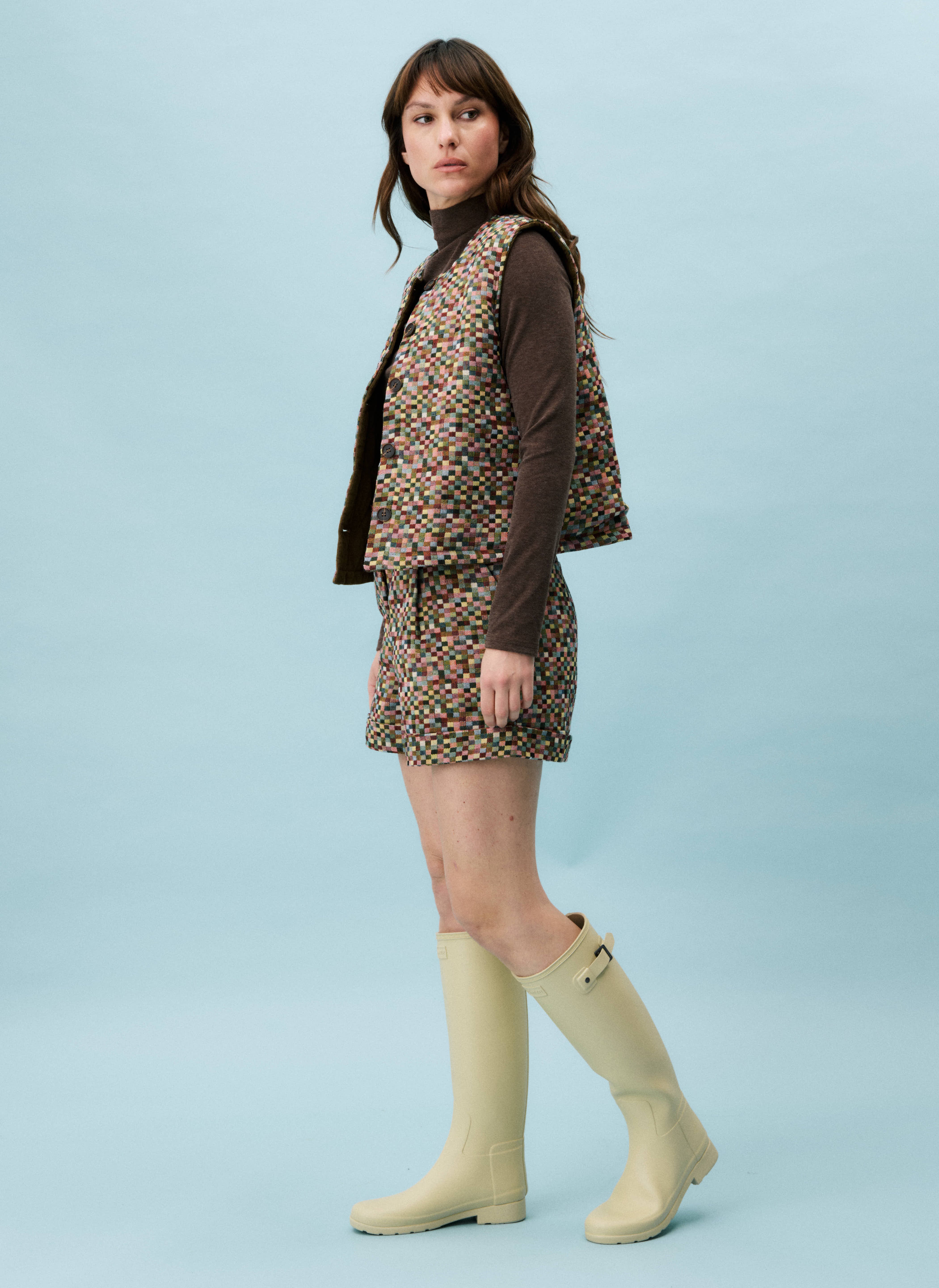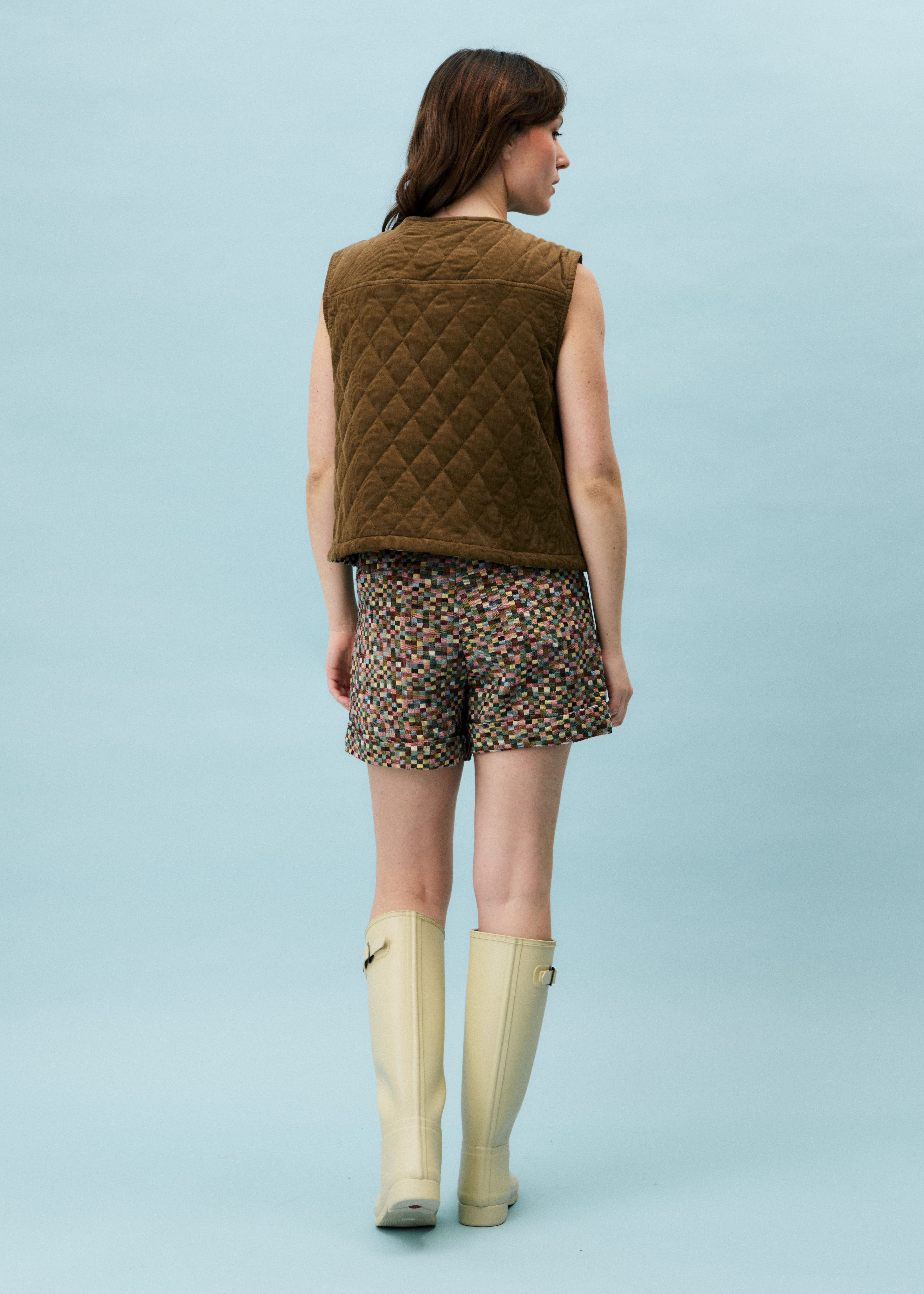 Reversible gilet with round neck and button closure. One side is in brown, soft mini corduroy with chest pockets and the other in a gorgeous brown, pink and green gingham.