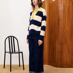 Polo jumper with wide stripes in navy and cream with a yellow contrast open collar.