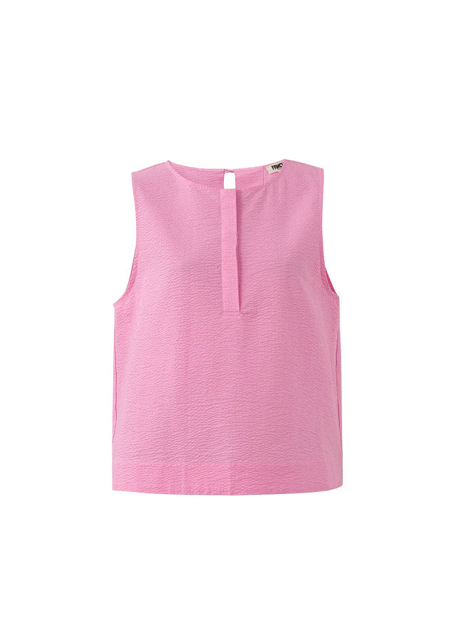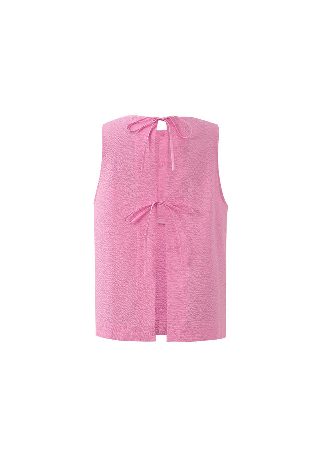 Sleeveless top with high round neck and gorgeous tie closer in the back - leaving it open and bare.