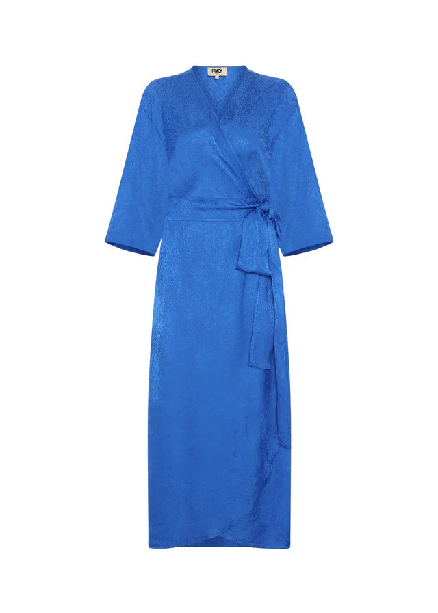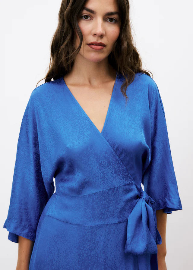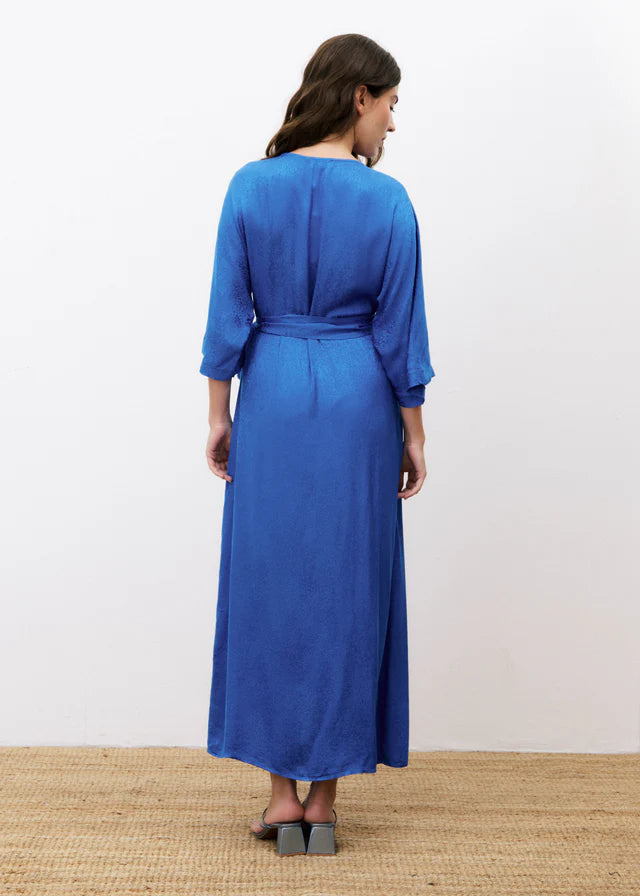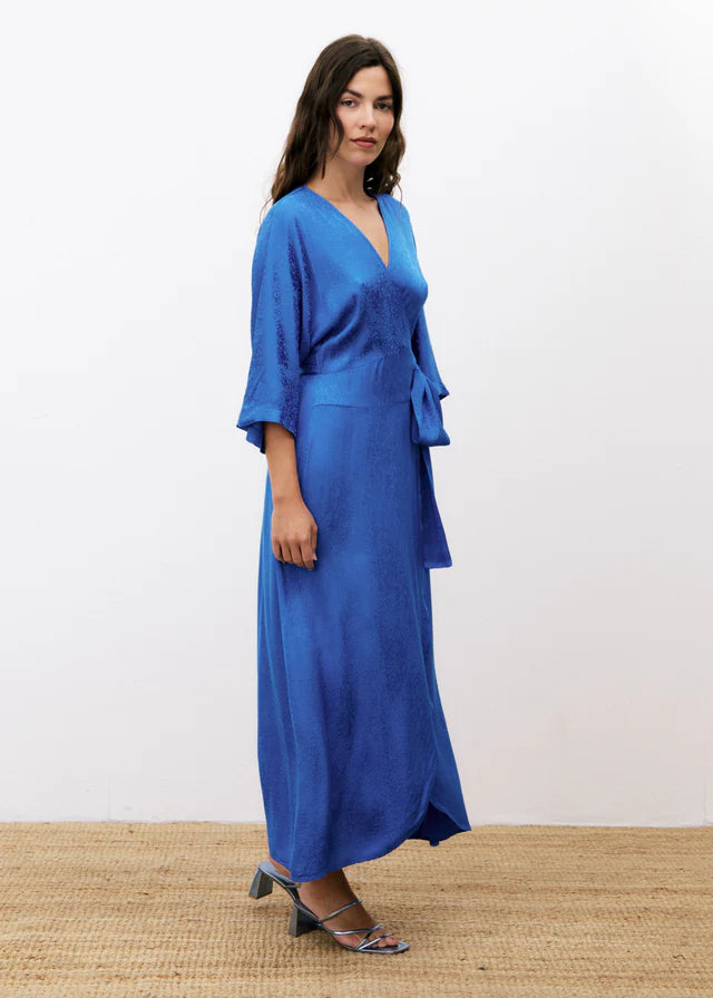 Long wrap dress with curved hemline, V-neck and 3/4 length sleeves. Comes in a gorgeous, silky Azure Blue.