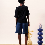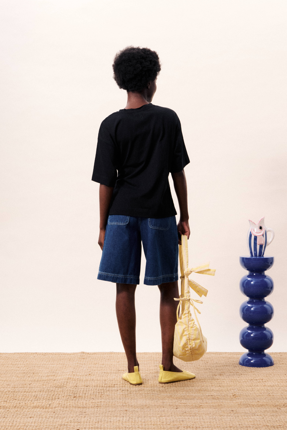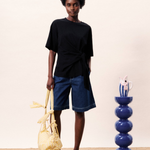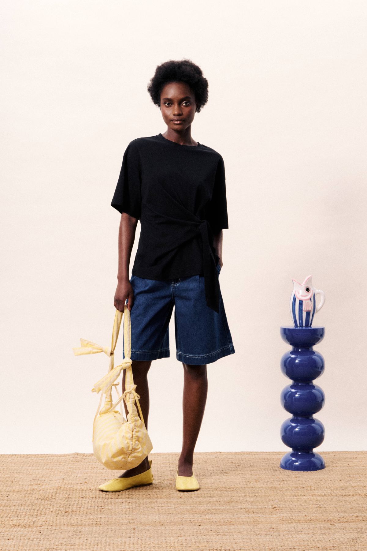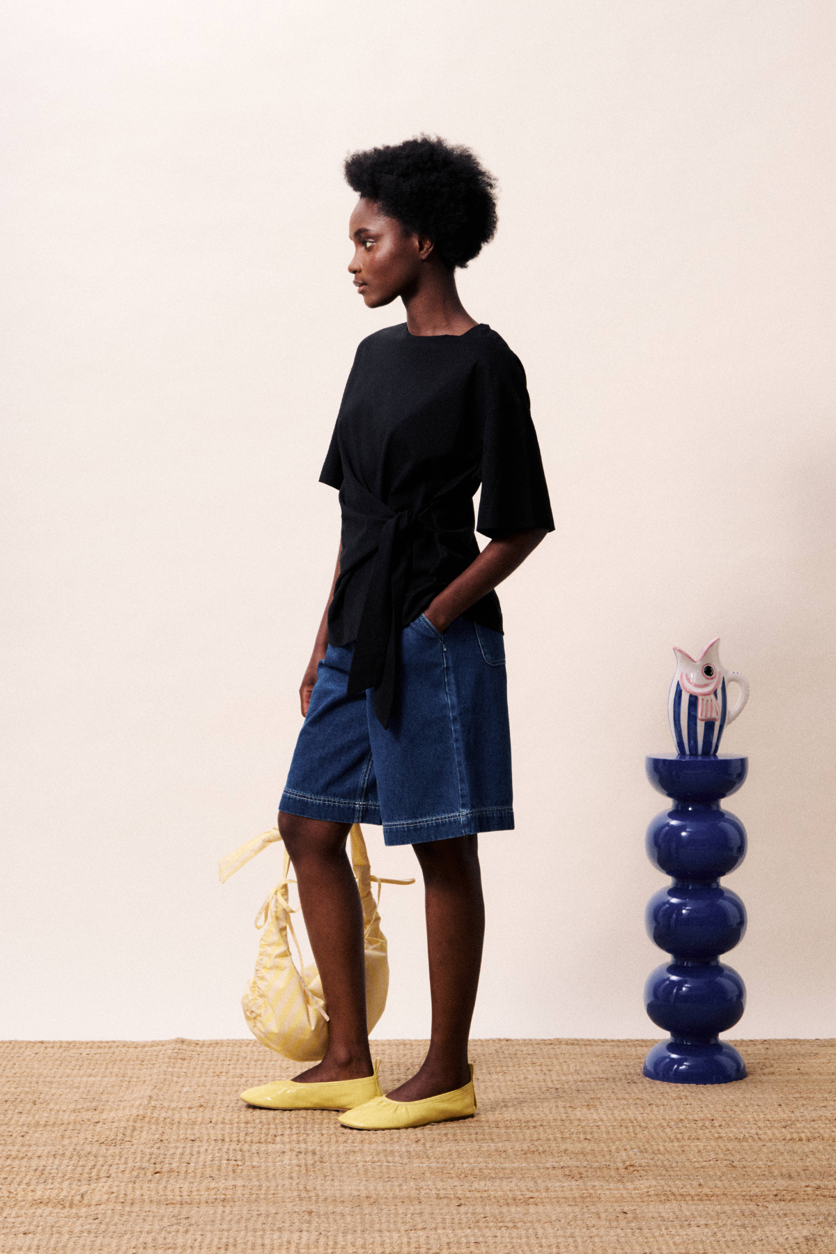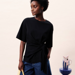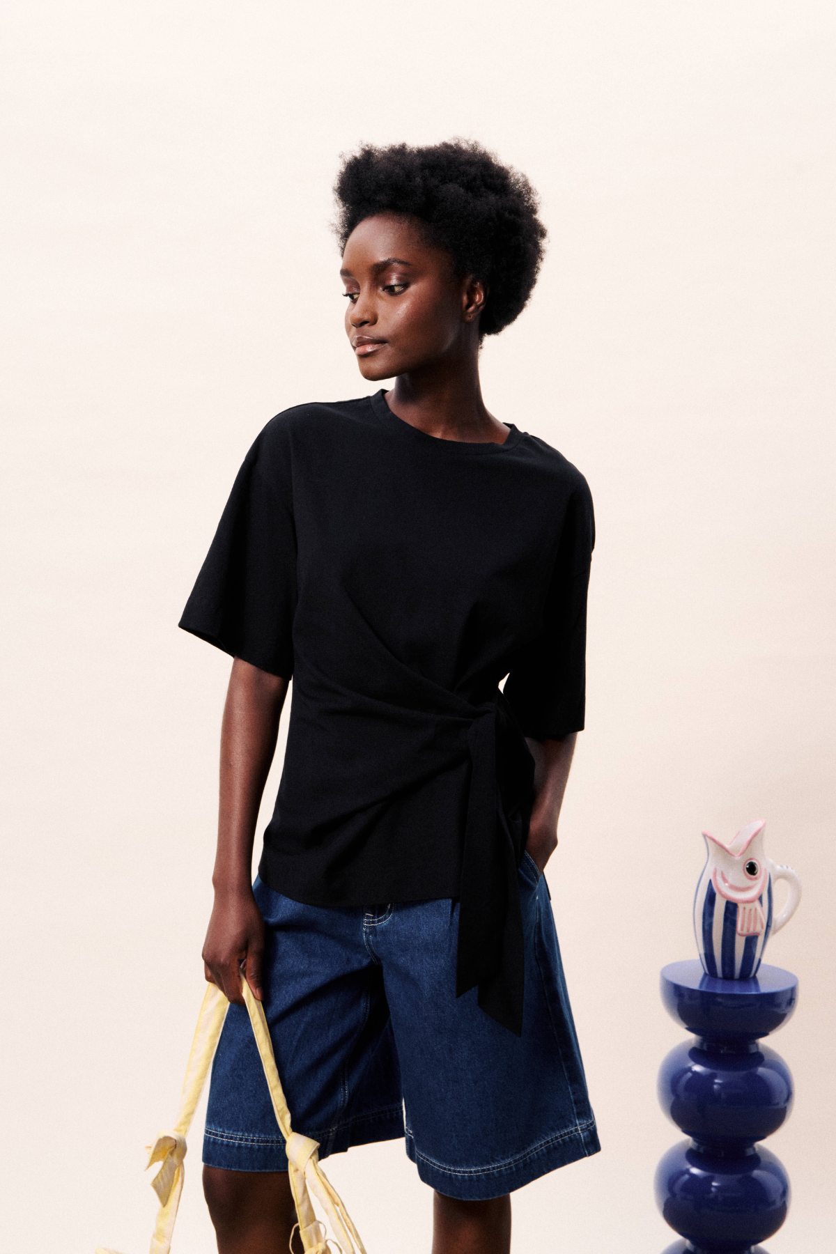 Longer T-shirt with straps to tie in front for cinching in the waist, creating flattering silhouette.