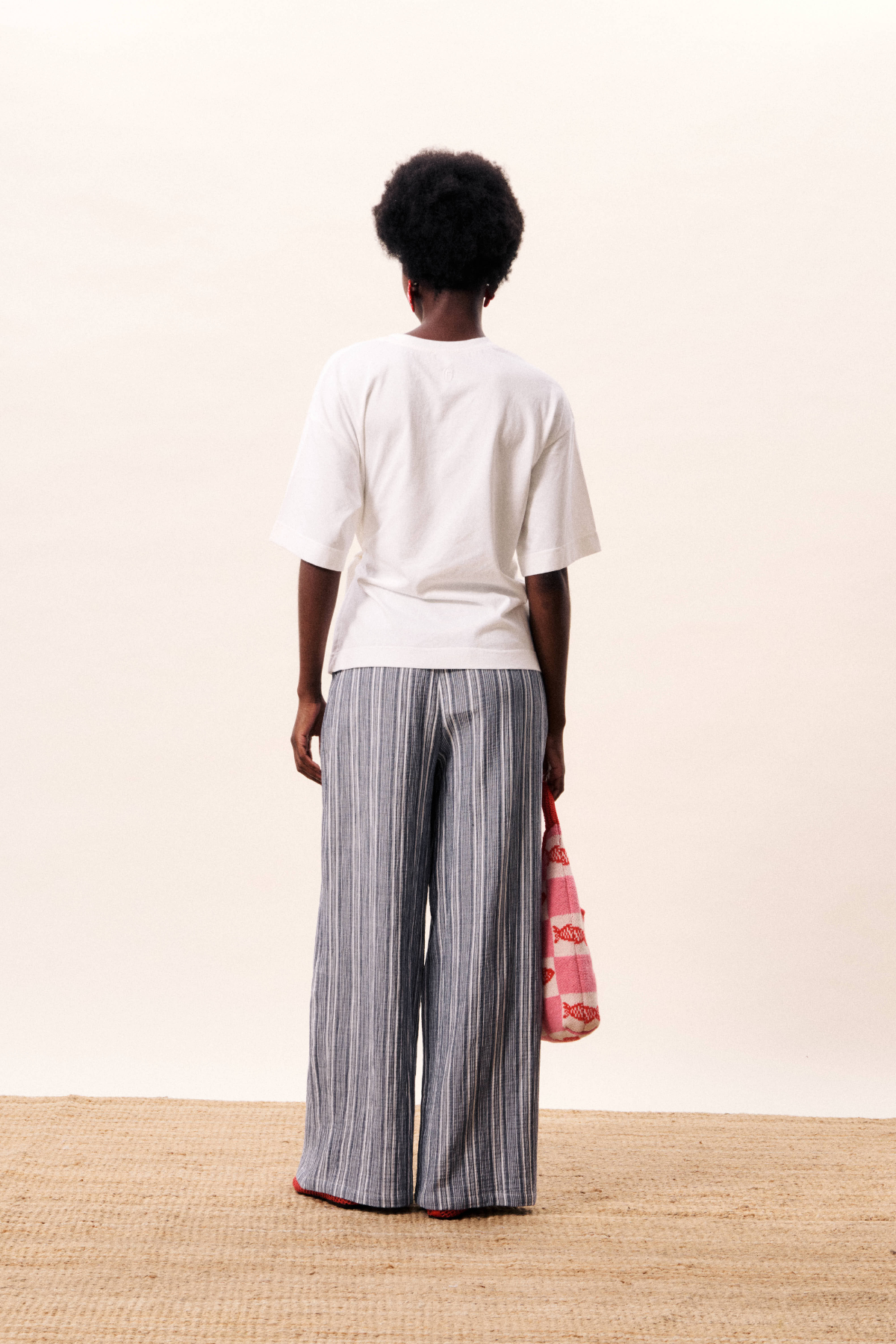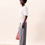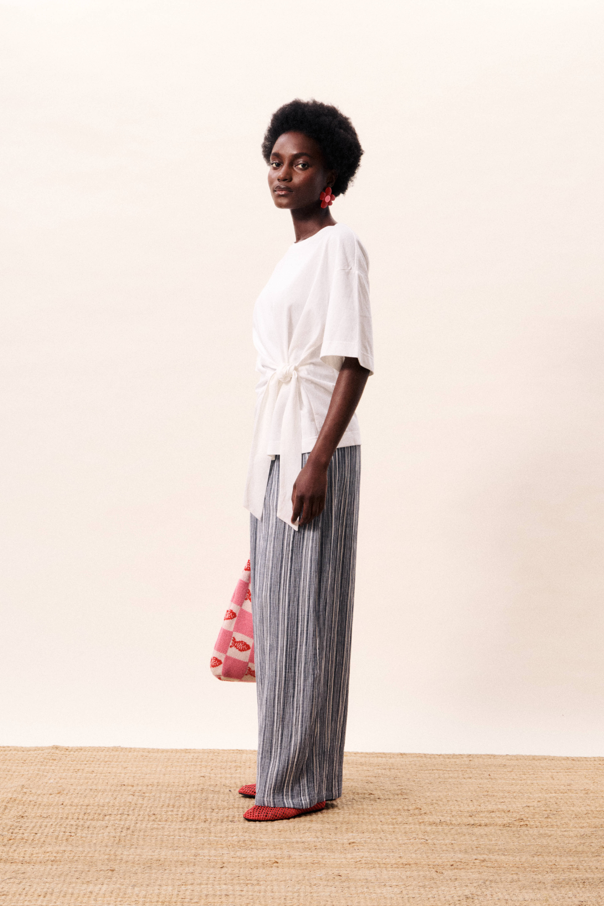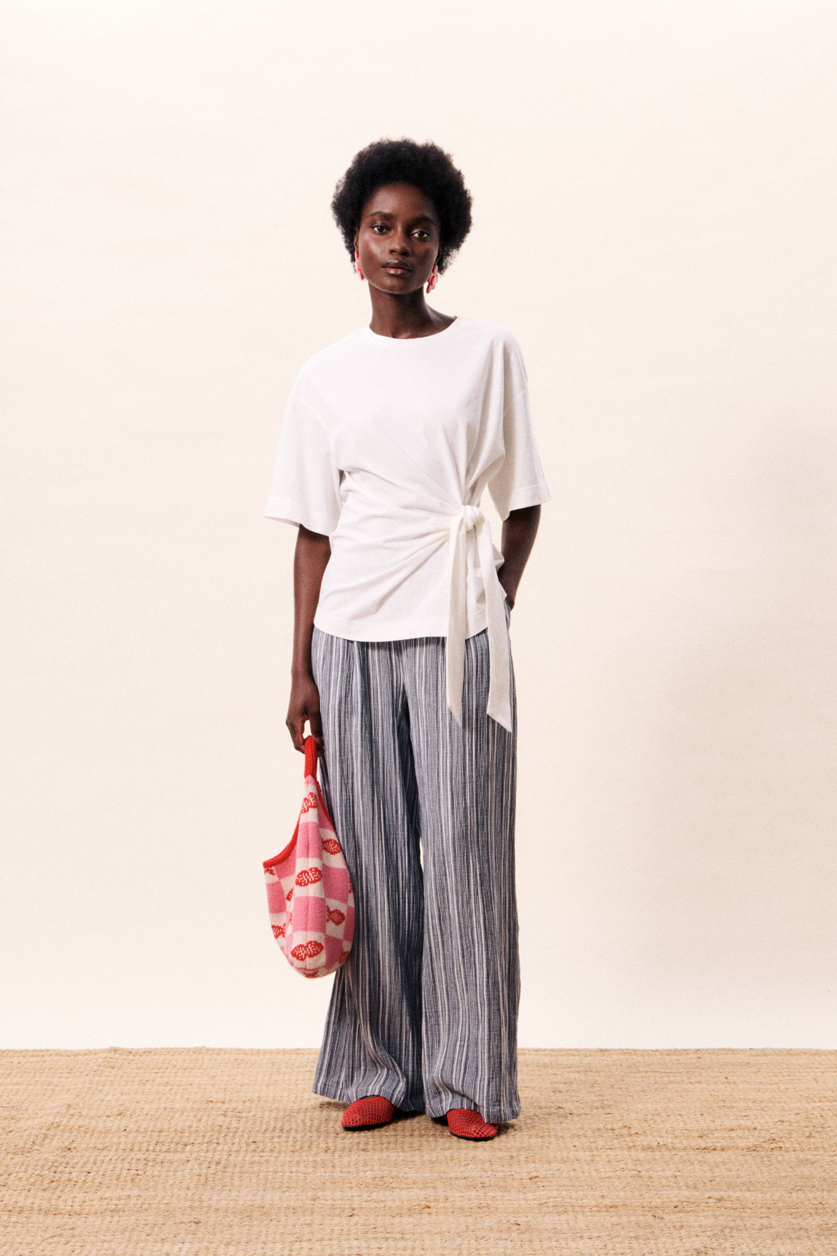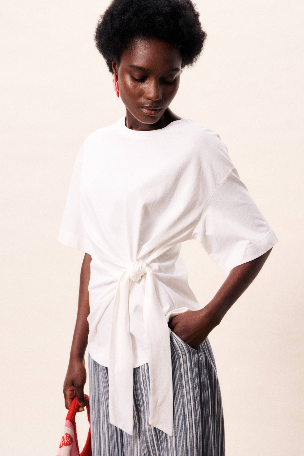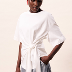Longer T-shirt with straps to tie in front for cinching in the waist, creating flattering silhouette.