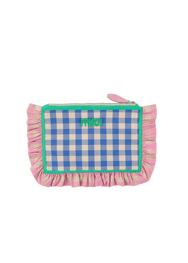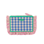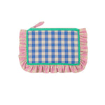 Checked fabric clutch with gathered ruffles along the edge and zip closure.