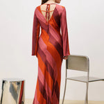 Silky maxi dress cut on the bias with round neck and long flute sleeves. Gorgeously vibrant in red, purple and pink diagonal stripes and a open V back with tie strings.
