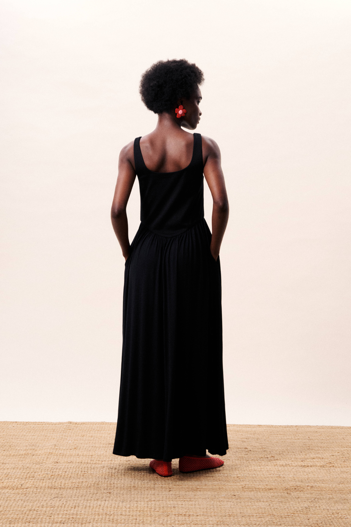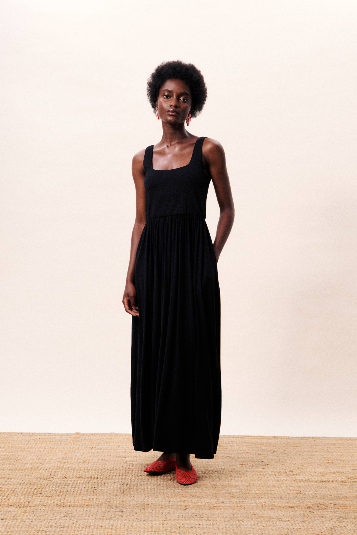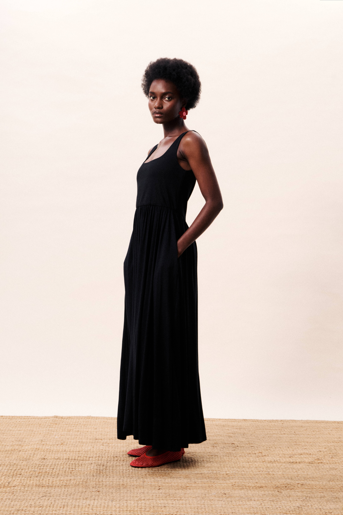 Easy, long sleeveless dress with U neckline and side pockets. The waist is elasticated to create shape whilst keeping it comfortable.