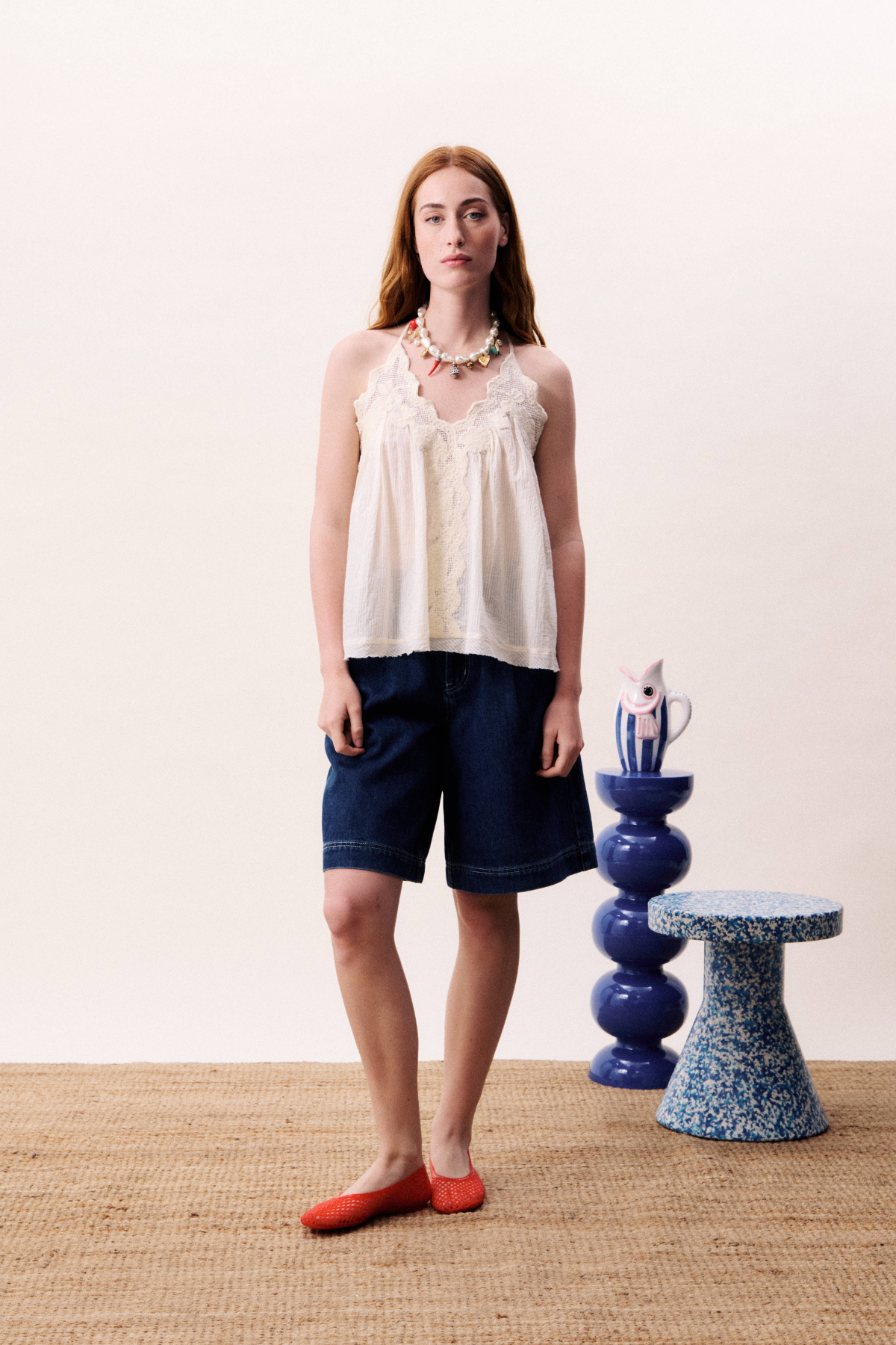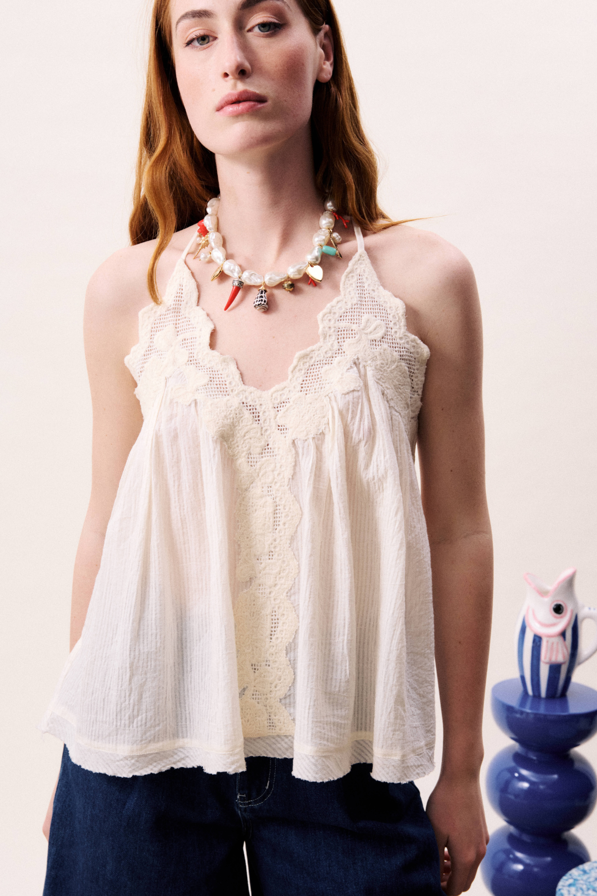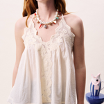 Loose fit top with V-neck, halter neck design. Made special by romantic, decorative lace.