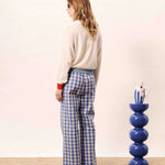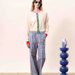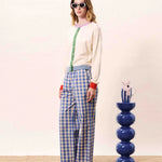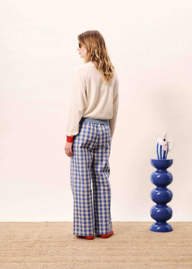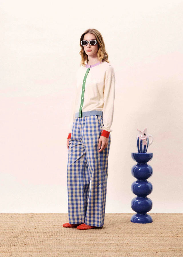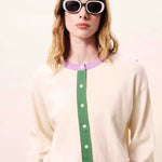 • Colour block details: purple collar, red cuffs, blue-grey hem