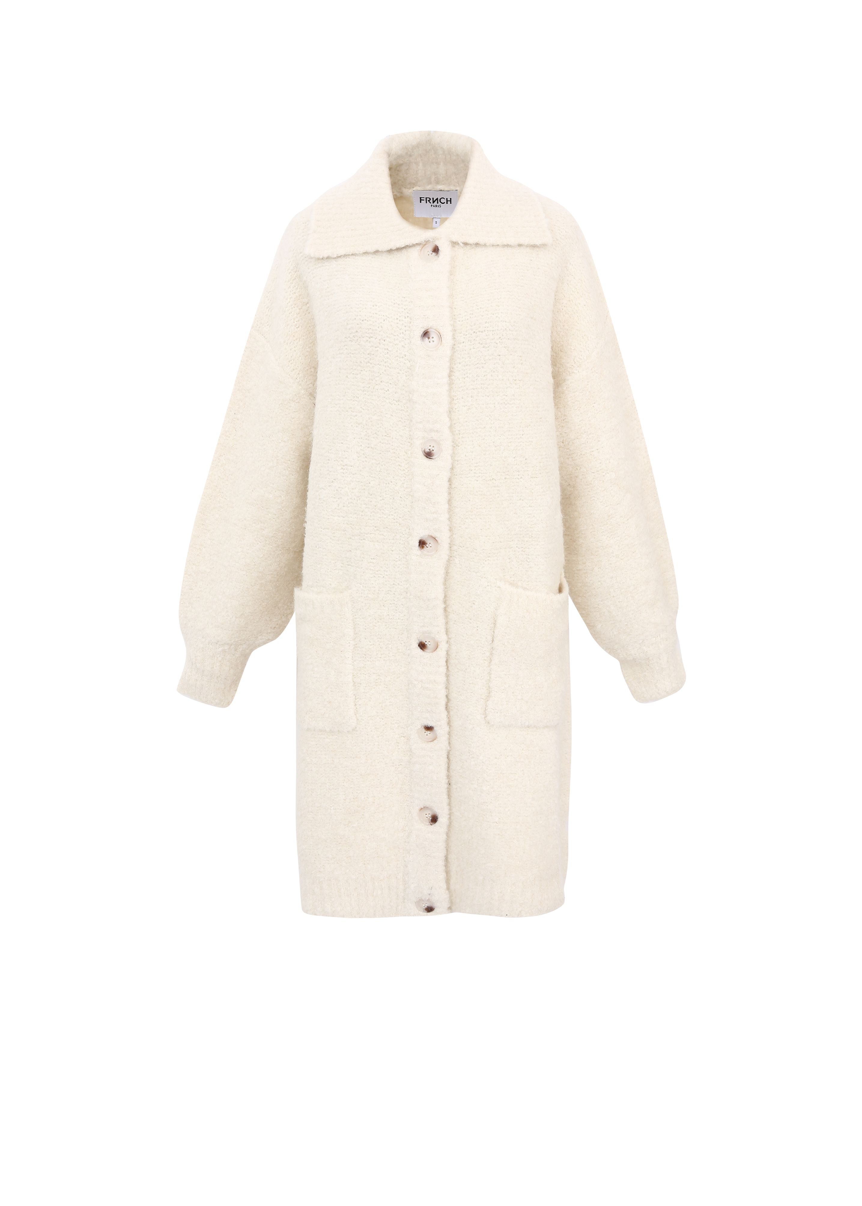 Thick, fluffy long cardigan with button closure and collar. This piece works just as well as a layer or as a jacket depending on the temperature.