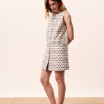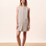 Straight cut mini dress with high, round neckline and buttons through the front. The dress features a contrasting geometric pattern and front sliot pockets.