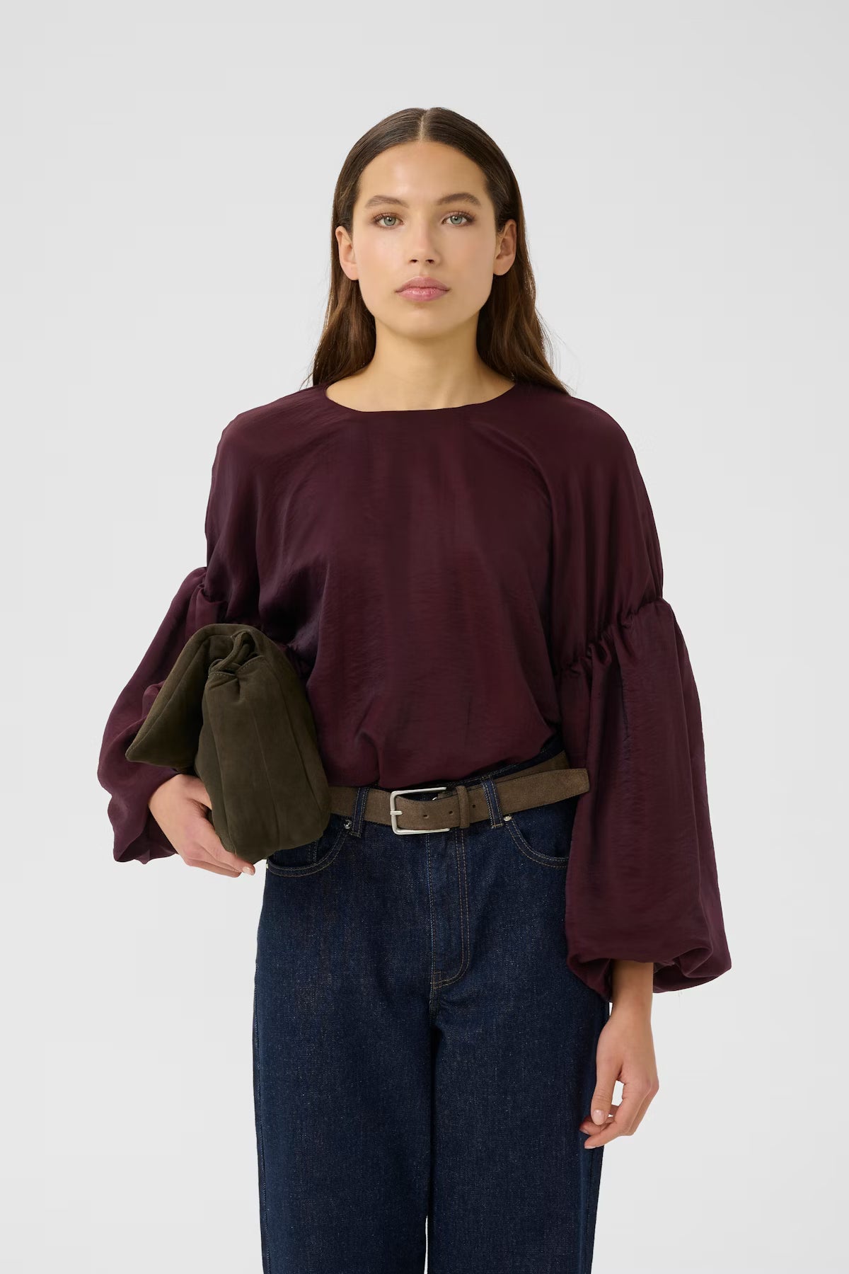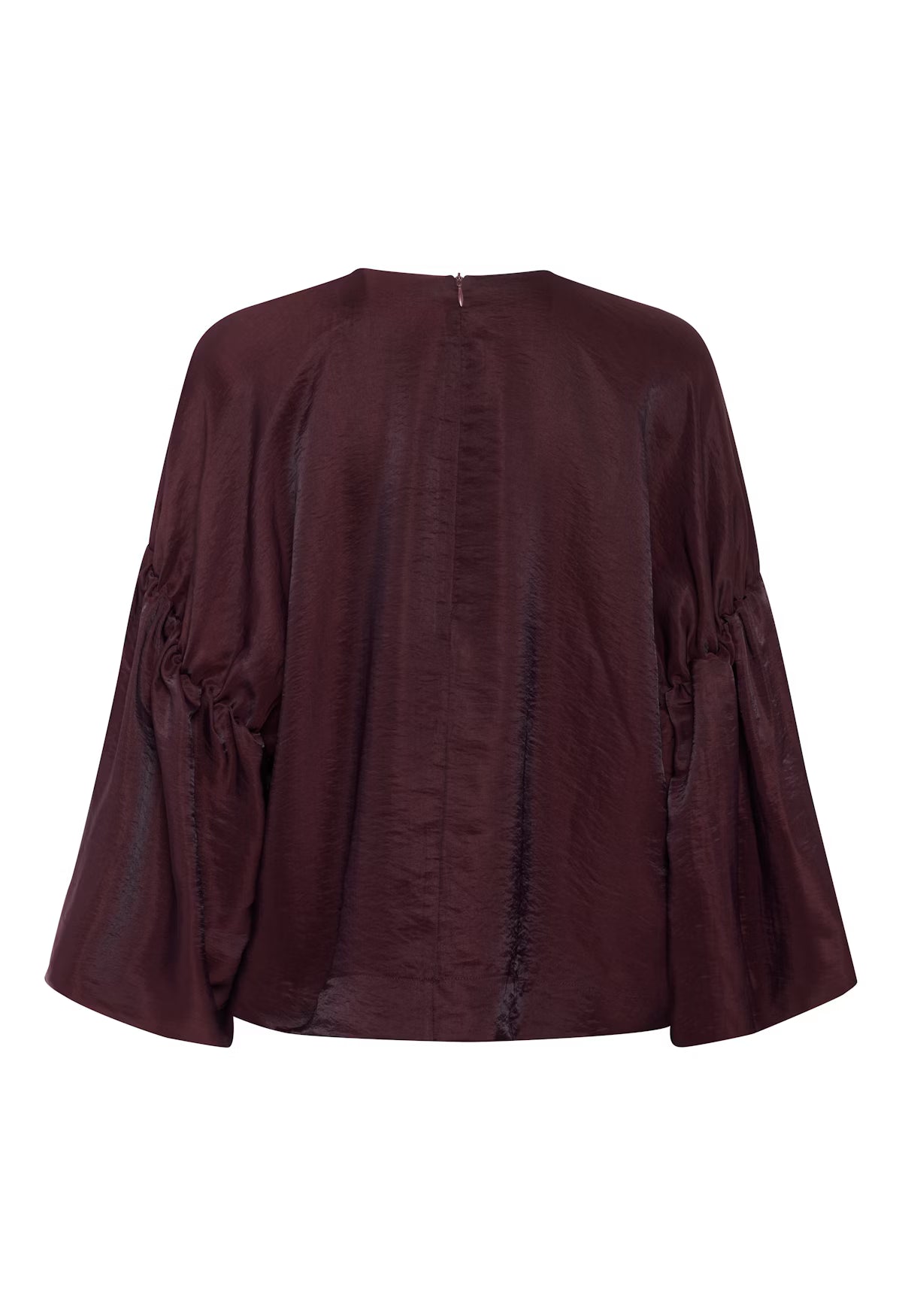 Blouse in glossy fabric with a round neckline and long, wide sleeves. The sleeves feature gathered details that create a light and elegant drape.