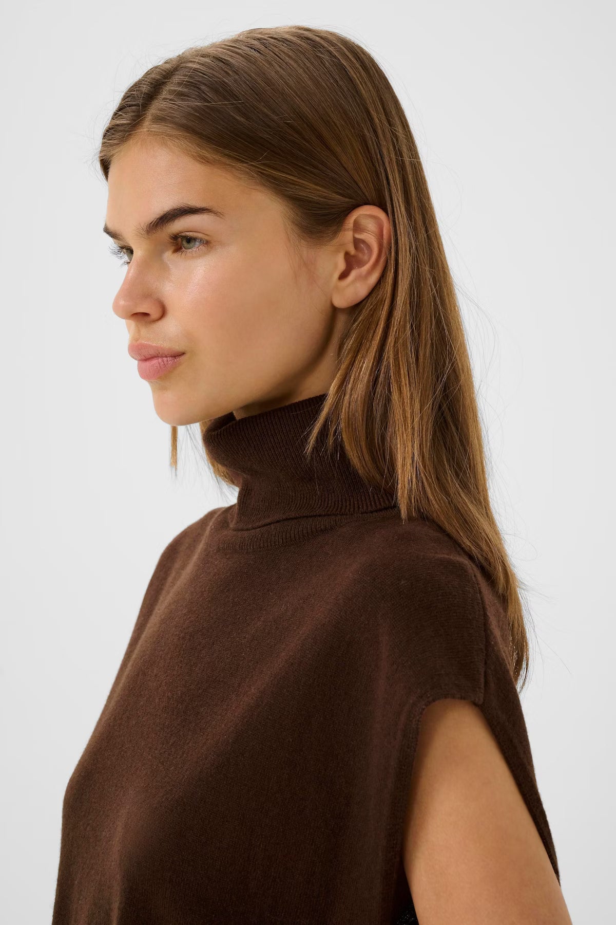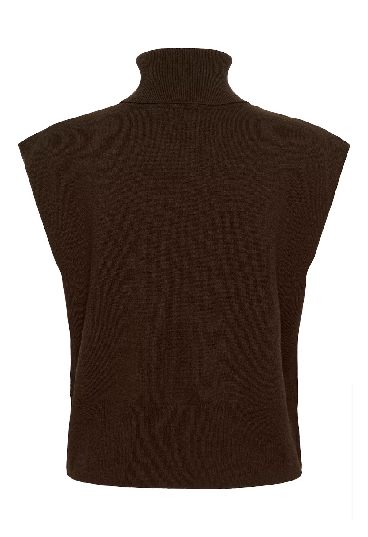 Knitted sleeveless turtleneck vest offering a comfortable relaxed fit. Features a high neckline and a straight-cut silhouette, versatile for layering or standalone wear in any season.