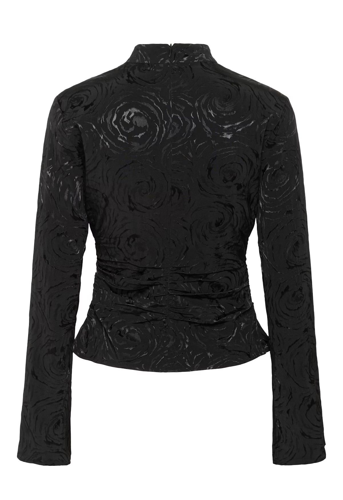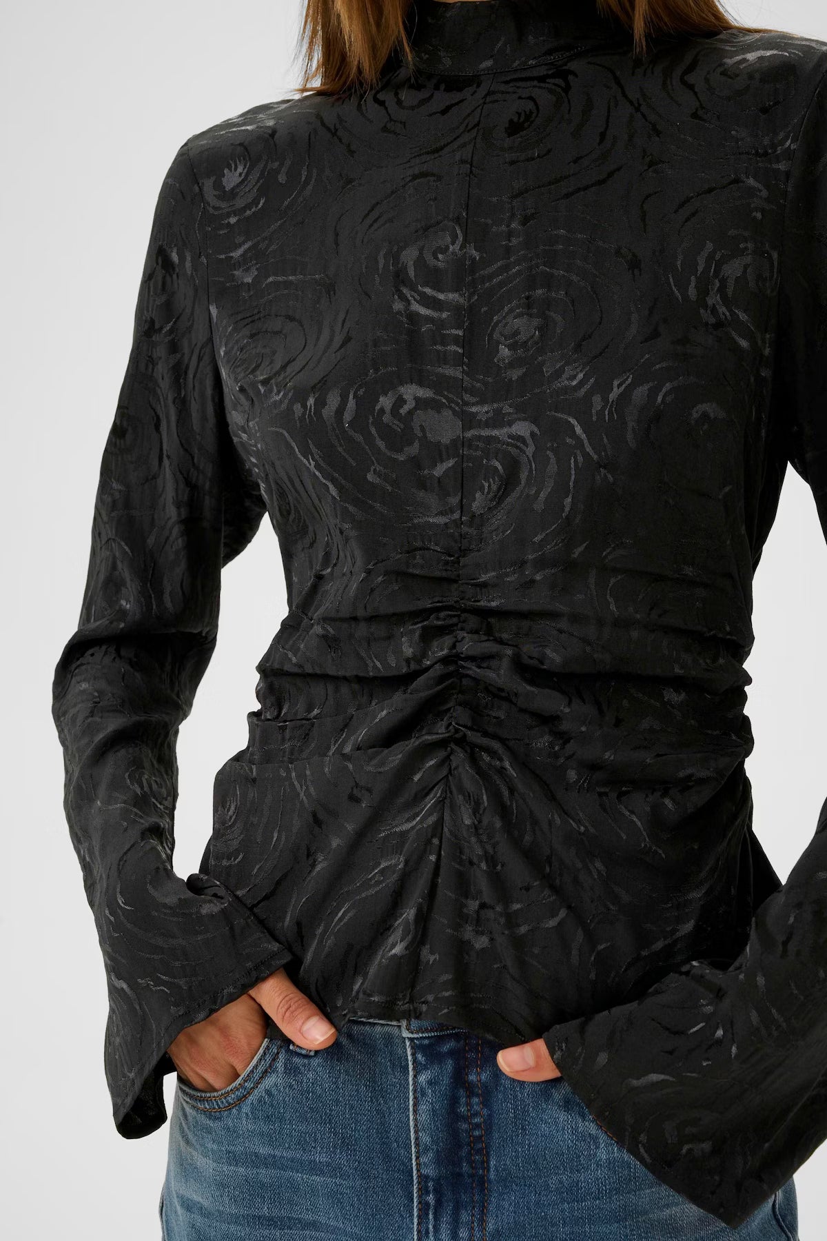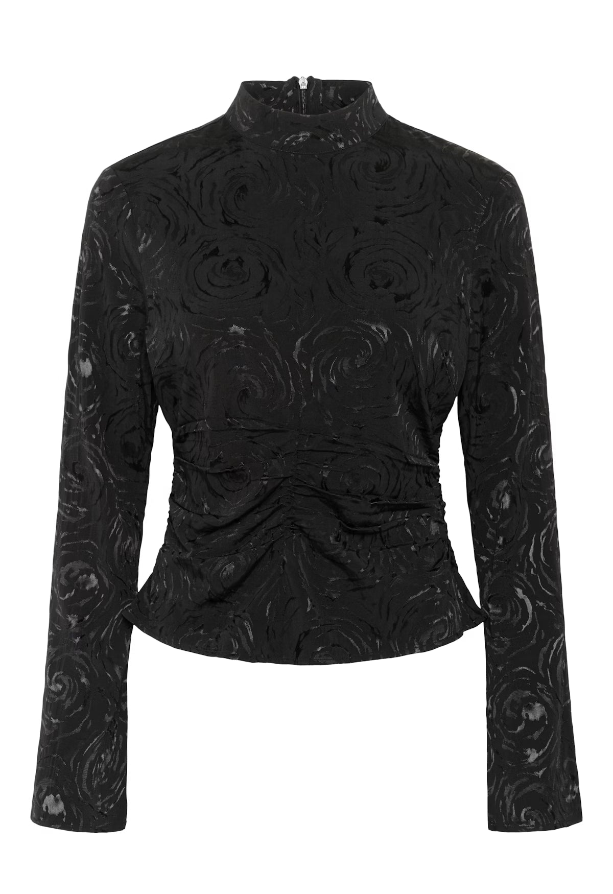 This fitted blouse features a sophisticated high neckline, long sleeves, and ruched front detailing for shaping. Designed for versatile style and comfortable all-day wear, it flatters the silhouette and pairs well for any occasion.