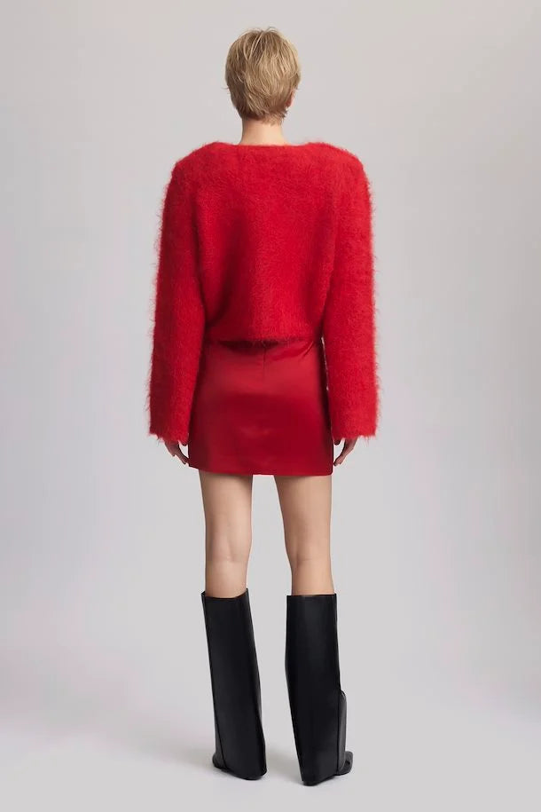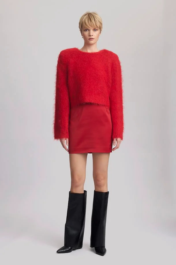 Knitted jumper with round neck and padded shoulders. It's slightly cropped and has long relaxed sleeves.