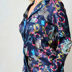 Join the wild side this season in our Suzanne satin pyjama set. Complete with a matching fabric bag and contrast blue piping, these pyjamas feature a signature, hand-painted Hope & Ivy print, with eclectic zebras, snakes, and all manner of eye-catching florals. With a button-up shirt offering a relaxed fit and elegant collar, plus trousers that drape effortlessly for a sleek silhouette, this is the perfect pyjama set for those who wish to lounge in style all season long.